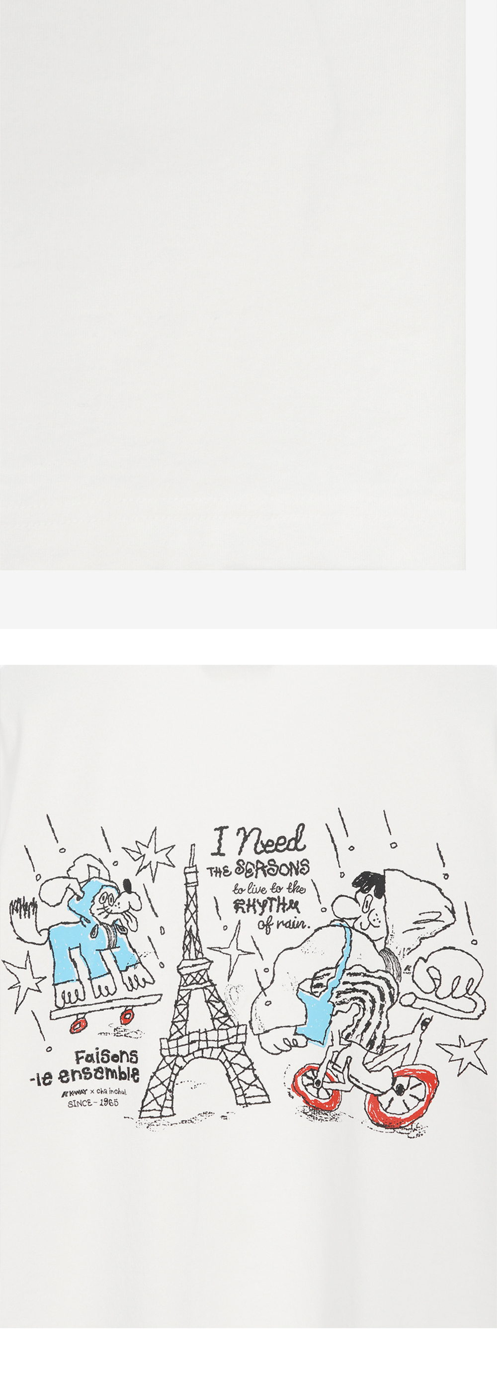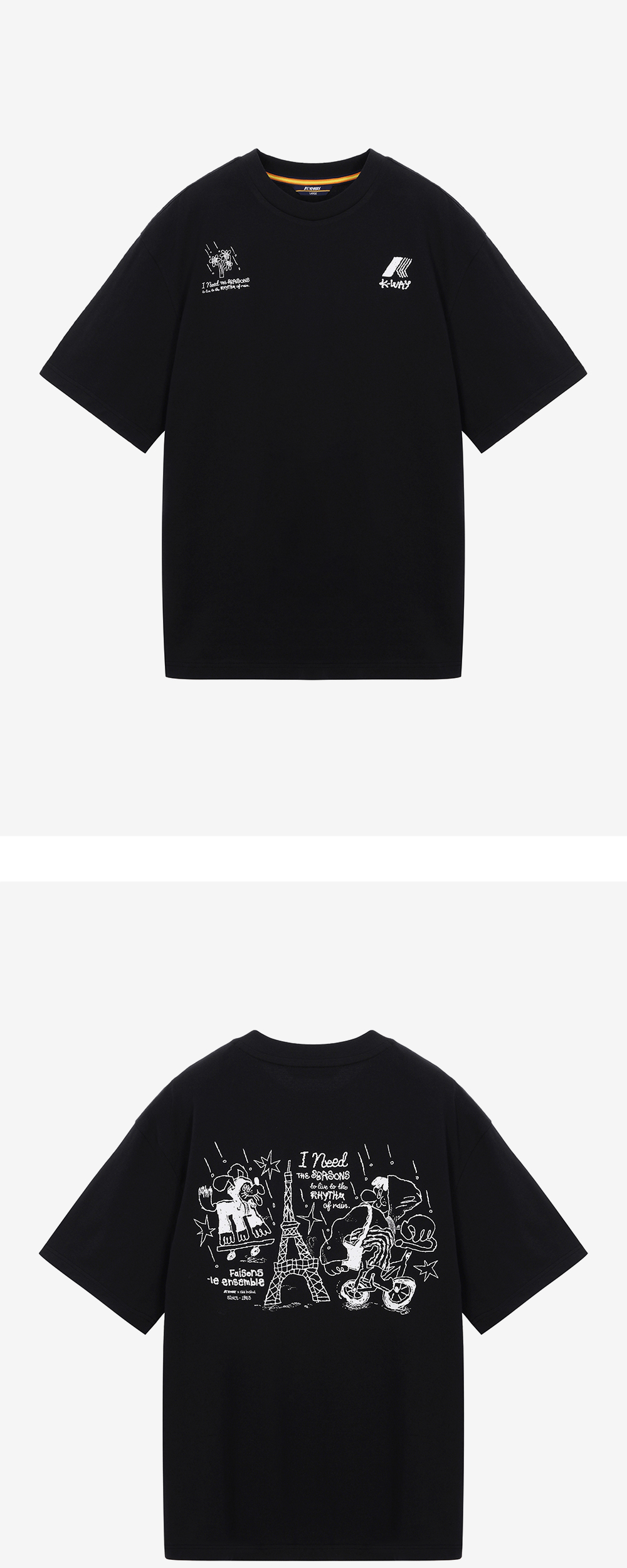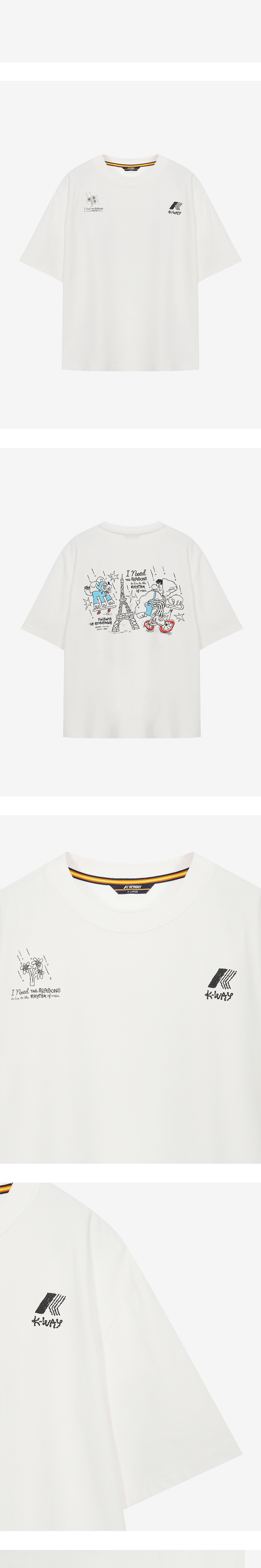 일러스트레이터 '차인철 작가'와 함께 작업한 그래픽 티셔츠 흡한속건에 최적화된 에어로쿨 원단 사용 비내리는 파리에서 까웨를 착장하다 컨셉 그래픽 컬러풀한 '차인철 작가' 그래픽 포인트 컴포트핏 Model Size Man 185cm, L 착용 Woman 173cm, S 착용