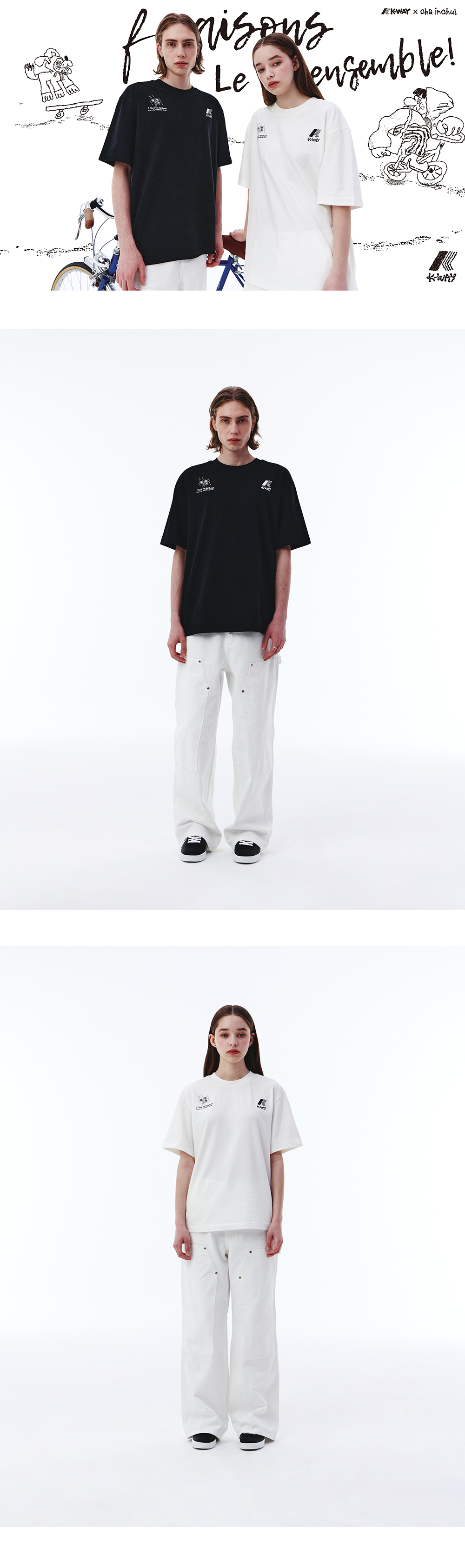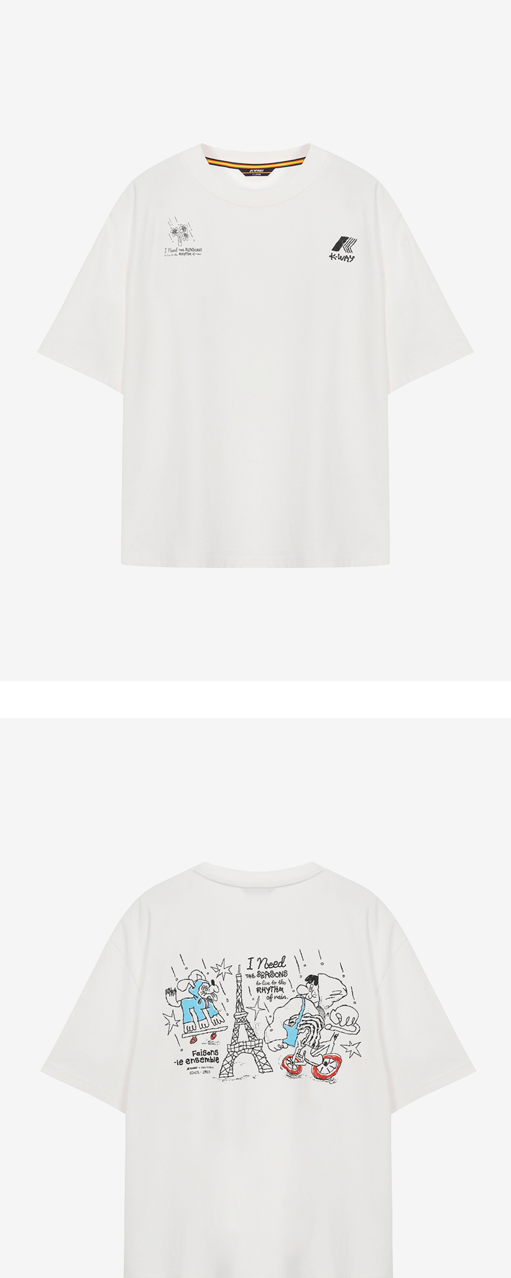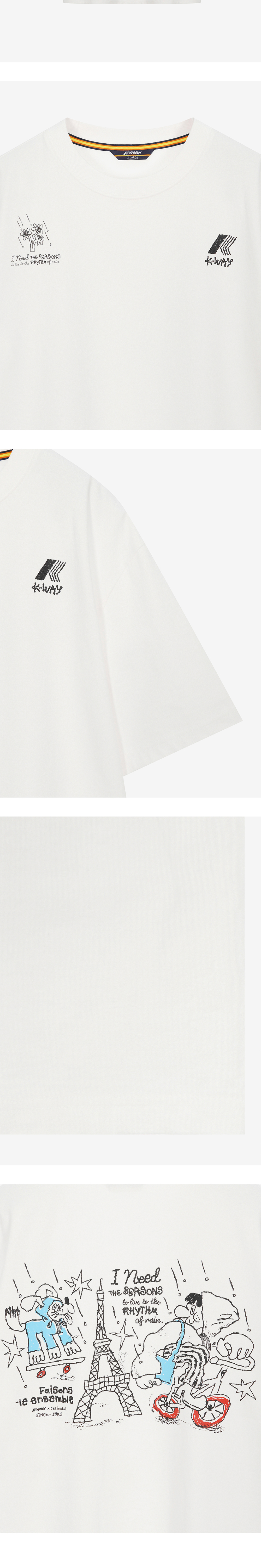 일러스트레이터 '차인철 작가'와 함께 작업한 그래픽 티셔츠 흡한속건에 최적화된 에어로쿨 원단 사용 비내리는 파리에서 까웨를 착장하다 컨셉 그래픽 컬러풀한 '차인철 작가' 그래픽 포인트 컴포트핏 Model Size Man 185cm, L 착용 Woman 173cm, S 착용