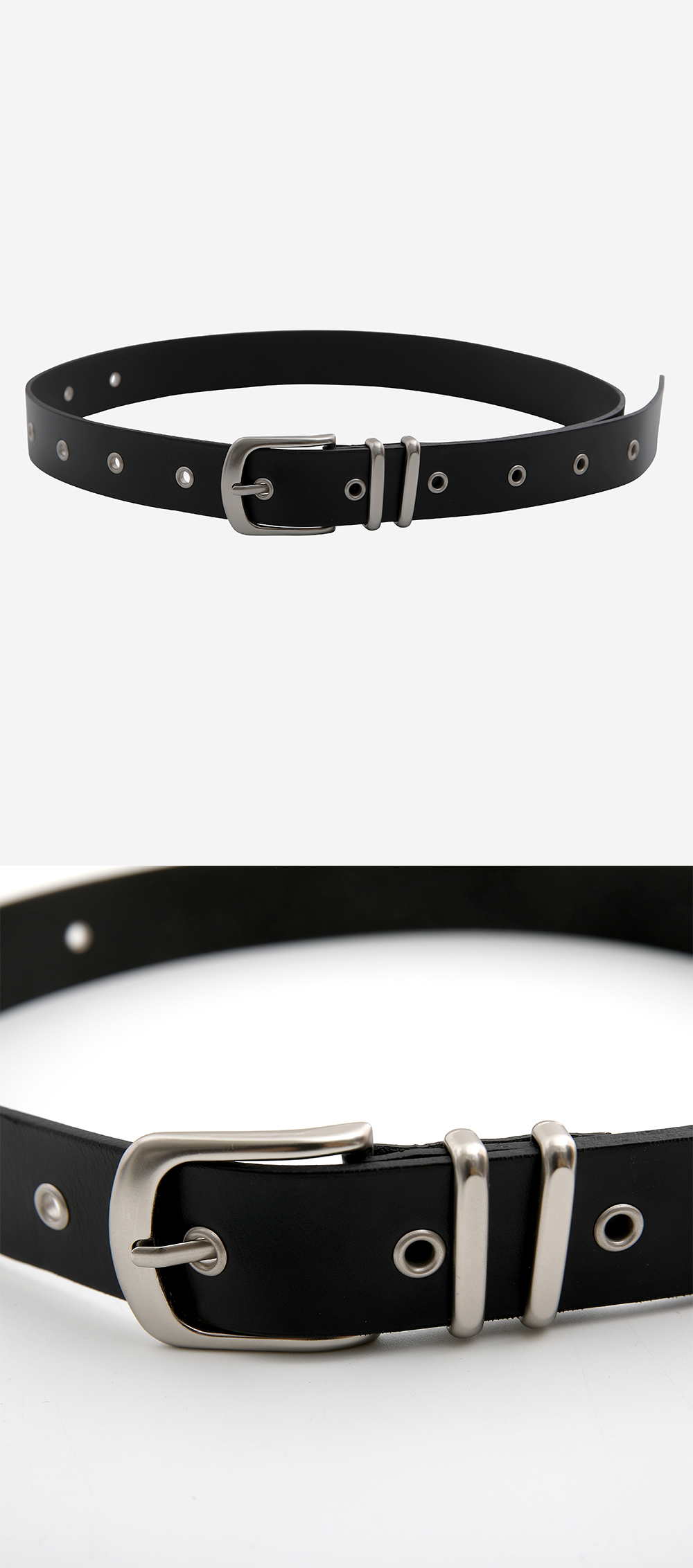 앤틱 실버의 고급스러운 버클과 아일렛의 조화가 멋스러운 레더 벨트입니다. 다양한 룩에 스타일리시한 분위기를 연출 해주는 아이템입니다. -DETAIL- 아일렛 디테일 앤틱 실버 버클