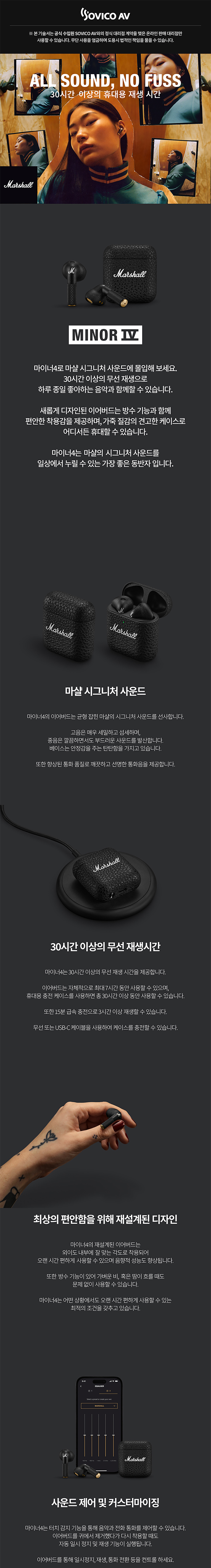 새롭게 디자인된 마샬 마이너 4는 방수 기능과 함께 편안한 착용감을 제공하며 가죽 질감의 견고한 케이스로 어디서든 휴대할 수 있습니다. 마이너4은 마샬 시그니처 사운드를 일상에서 누릴 수 있는 가장 좋은 동반자입니다.