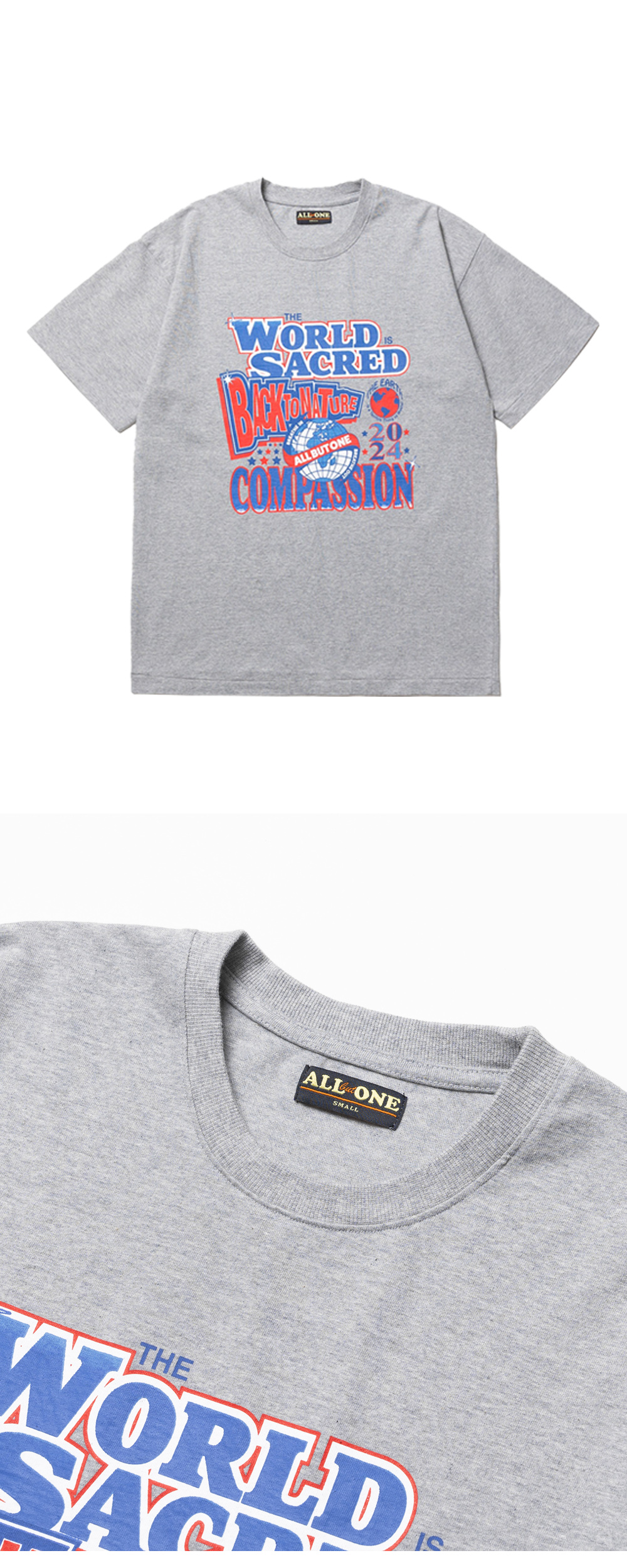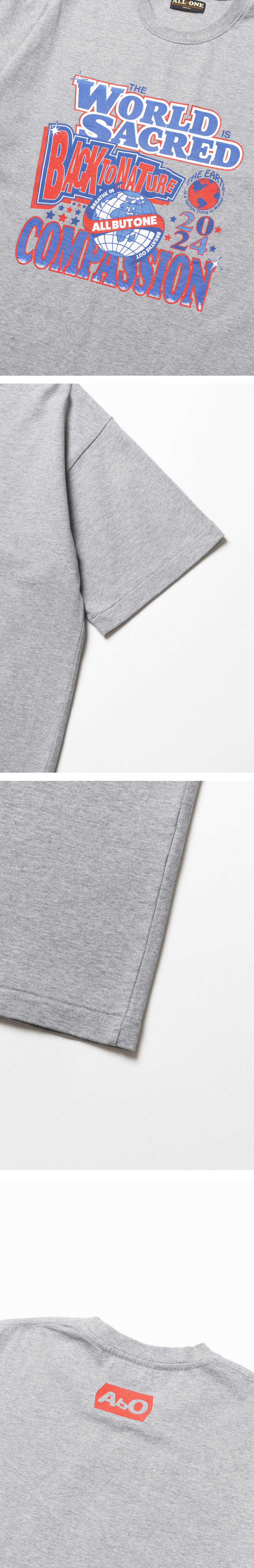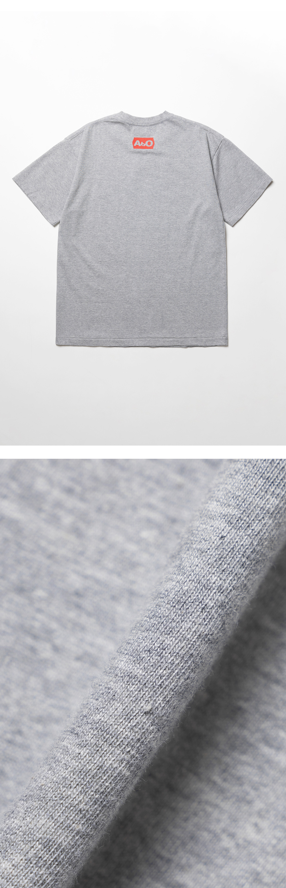 ABO Sacred Tee Melange Gray 에이비오 사크레드 티 멜란지 그레이 ABO의 시그니처 아트워크가 돋보이는 반팔 티셔츠 30수 2합의 두께감 있는 코튼 소재 사용 소매, 밑단 싱글 스티치 마감 디테일 어깨 부분 체인 스티치 마감 후면부 그래픽 프린팅이 특징