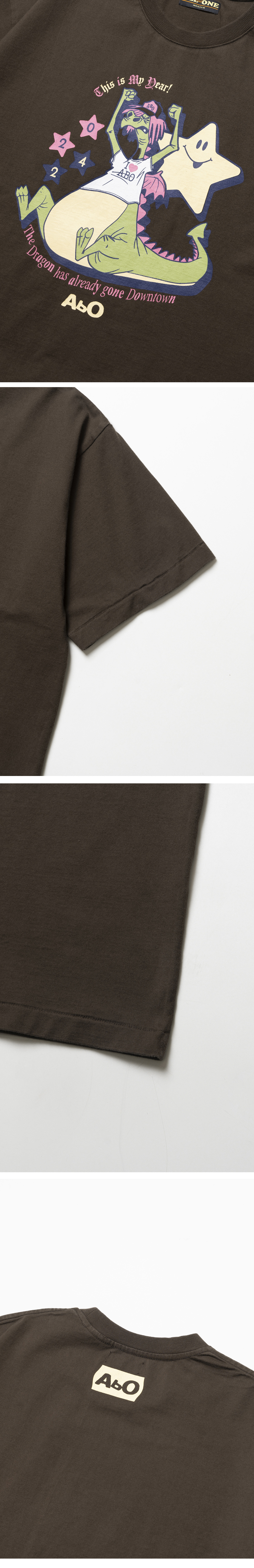 ABO Year T-Shirt Brown 에이비오 이어 티셔츠 브라운 ABO의 시그니처 아트워크가 돋보이는 반팔 티셔츠 30수 2합의 두께감 있는 코튼 소재 사용 소매, 밑단 싱글 스티치 마감 디테일 어깨 부분 체인 스티치 마감 후면부 상단에 브랜드 네임 로고 프린팅 디자인