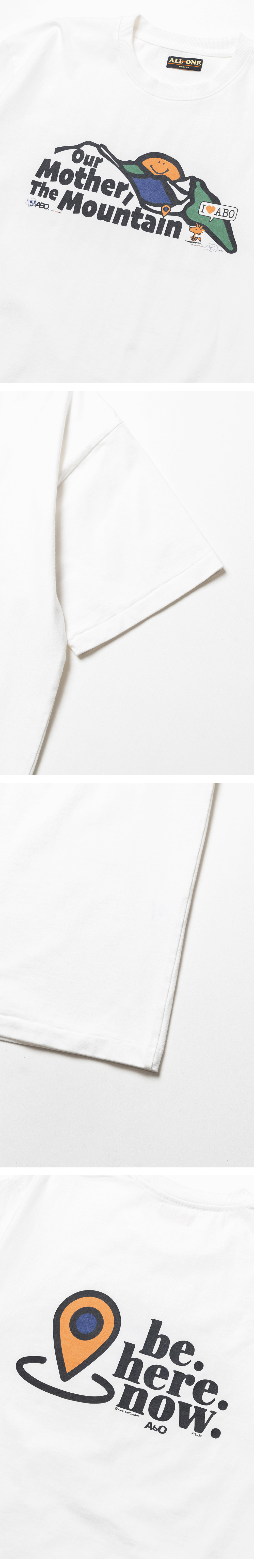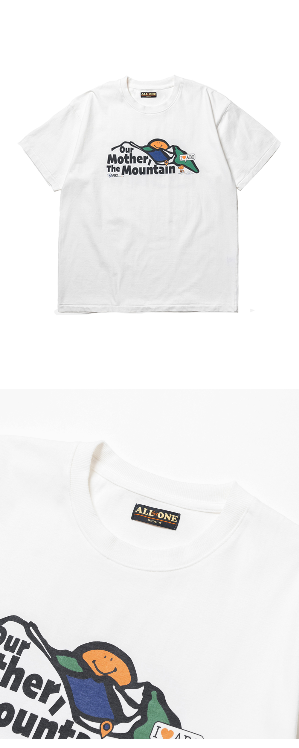 ABO Mother T-Shirt White 에이비오 마더 티셔츠 화이트 ABO의 시그니처 아트워크가 돋보이는 반팔 티셔츠 30수 2합의 두께감 있는 코튼 소재 사용 소매, 밑단 싱글 스티치 마감 디테일 어깨 부분 체인 스티치 마감 후면부 그래픽 프린팅이 특징