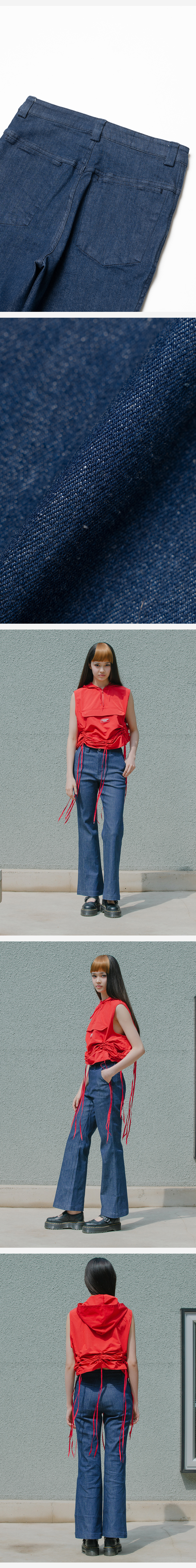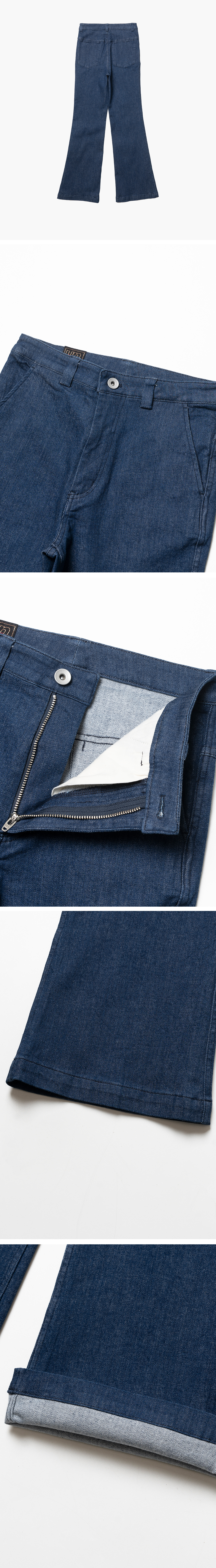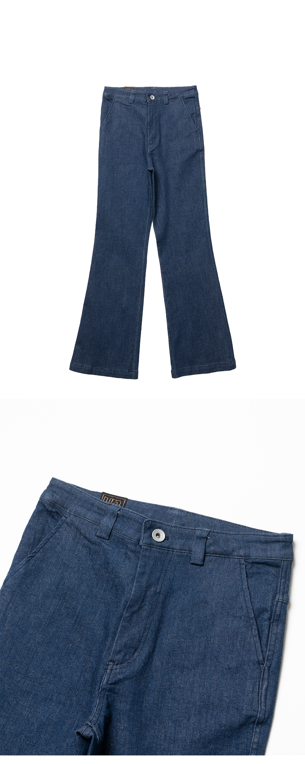 언노운 블루데님 팬츠입니다. 부츠컷 라인의 깔끔한 히프 포켓이 포인트입니다. 레깅스를 입은 듯 편안한 착용감의 바지입니다. 사계절 착용 가능한 데일리 팬츠입니다. 워싱 처리되어 있으며, 스트레치 데님입니다.