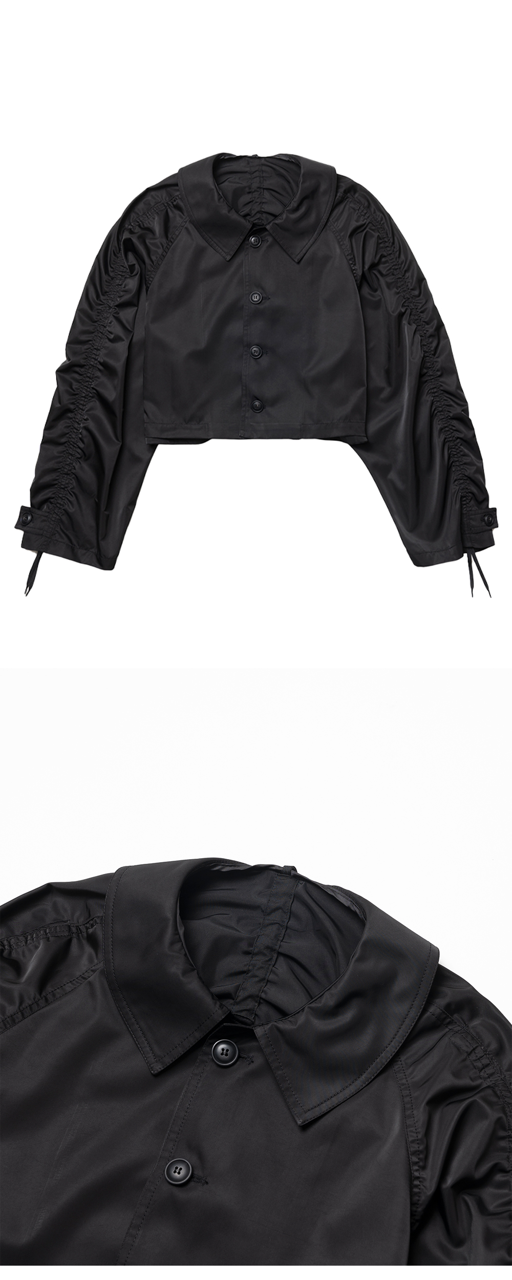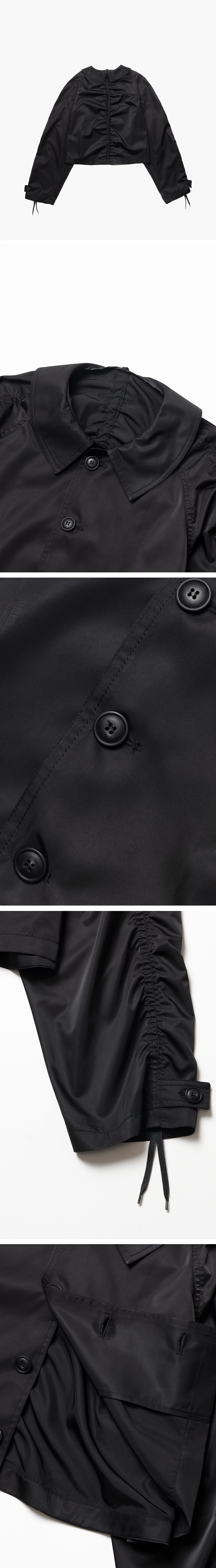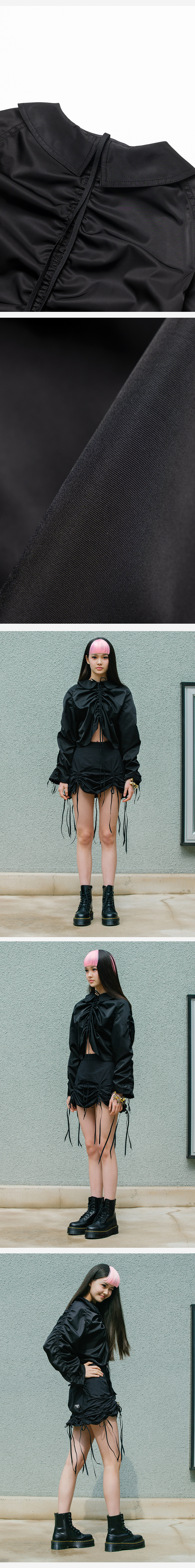 와이드 한 실루엣의 크롭 재킷입니다. 단정한 형태의 재킷에 스트링 디테일이 더해 여러 가지 스타일링 가능합니다. 소매 양쪽과 뒤 중심 노출된 테이프를 타이트하게 조이면 드러나는 실루엣은 캐주얼하며 여성스럽습니다. 가벼운 이너를 매치하여 포인트 아우터로 착용하시거나, 단품으로 스타일링 하셔도 좋습니다.