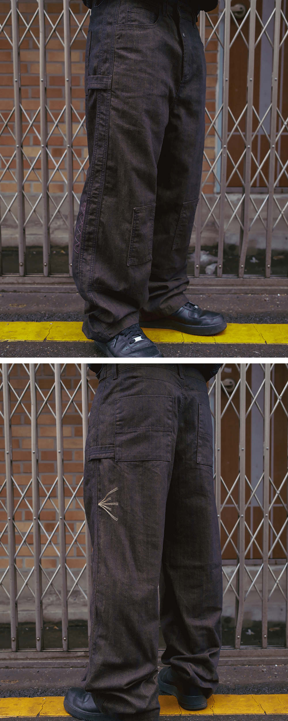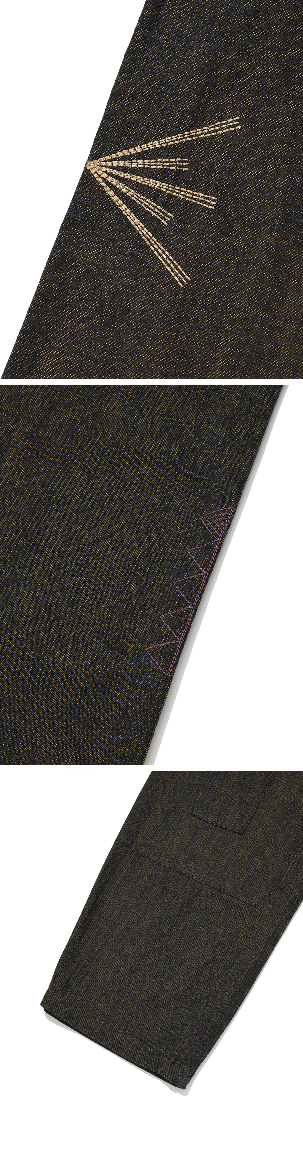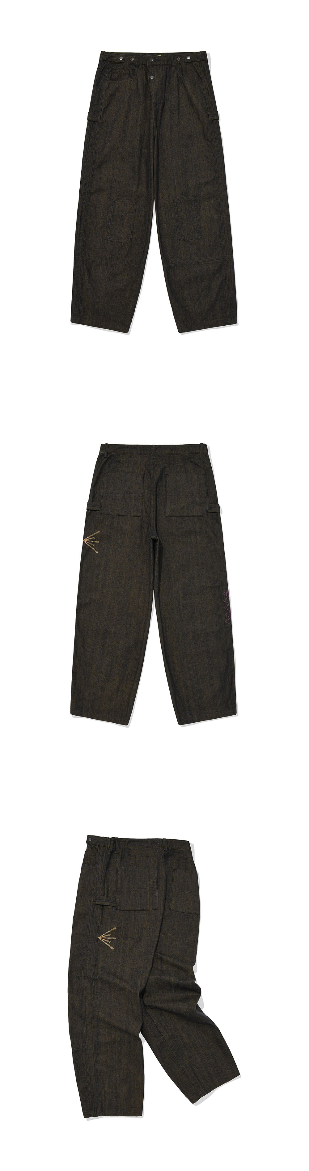 Product Info. - 계절감 영향이 없는 12.5oz 적당한 두께감의 데님 원단 - 은은한 컬러감의 컬러 데님 원단으로 제작된 독특한 무릎 패치 구조의 더블 니 팬츠 - 패턴 변형으로 유니크하게 떨어지는 와이드 한 실루엣의 테이퍼드 핏 - 후면 양쪽 인디언들의 말 문양 모티브의 자수 포인트 - 전면 곡선 형태의 라이즈 구조, 버튼 디테일 - 양 사이드 해머 루프 디테일 - 허리 사이즈 조절 가능한 전면 양 사이드 버튼 어드저스터 디테일 - 전면 레그 하단 절개 디테일 - ykk 지퍼, ykk 택버튼, ykk 리벳 사용