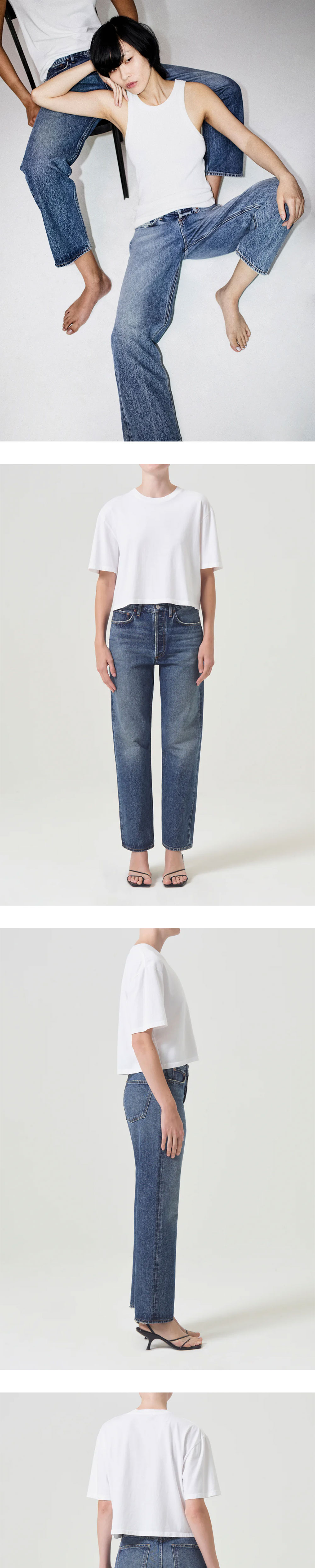 에이골디의 우먼 90's 진 미드 라이즈 루즈 핏은 추억을 불러일으키는 90년대 영감의 미드라이즈 디자인입니다. 허리와 엉덩이 부분은 여유롭게 핏되며, 루즈한 스트레이트 레그 실루엣이 특징입니다. - 시그니처 오가닉 코튼으로 제작 - 착용할 때마다 더욱 부드러워짐 - 루즈 핏 - 페이딩과 위스커링이 있는 깊은 중청색의 빈티지한 느낌과 깔끔한 밑단 - 부드러운 드레이프 * 모델 신체 스펙 : 177cm / 착용 사이즈 : 27