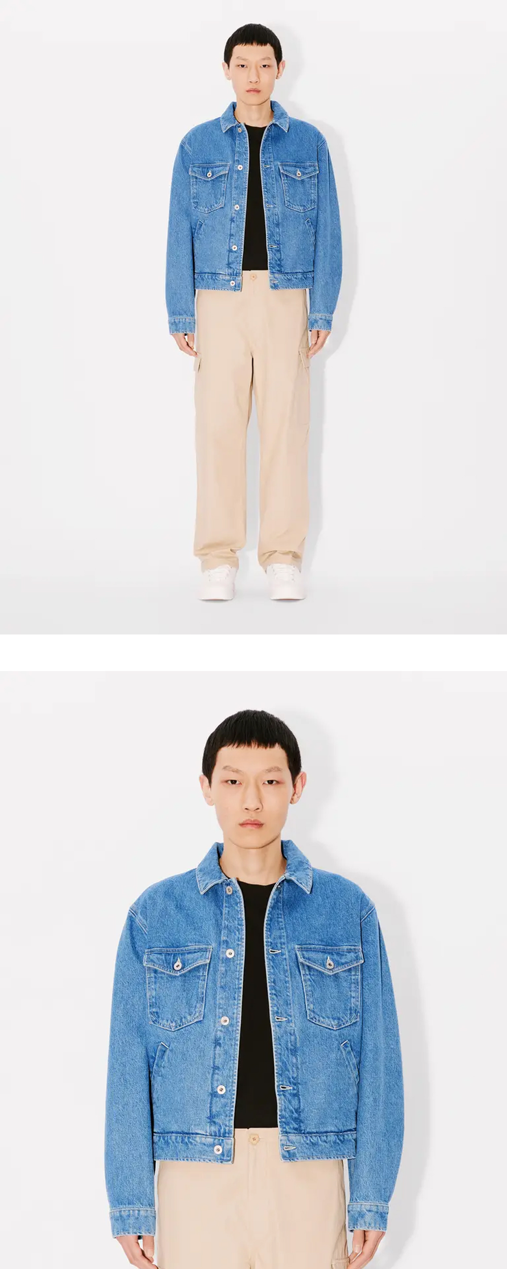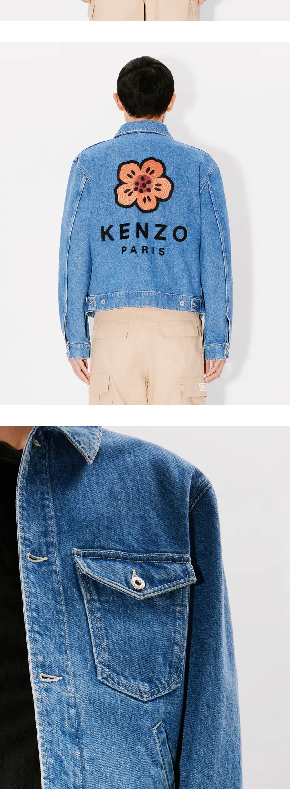 겐조 트러커 자켓 보크 플라워 스톤 블리치드를 소개합니다. 후면의 자수와 스톤 워싱된 색감이 특징입니다. - 스톤 워싱 - 뒷면에는 Boke Flower와 KENZO Paris 자수 - 카이하라 일본산 데님 - 단추가 달린 허리 탭 - 가슴 주머니 2개 - 두 개의 측면 포켓