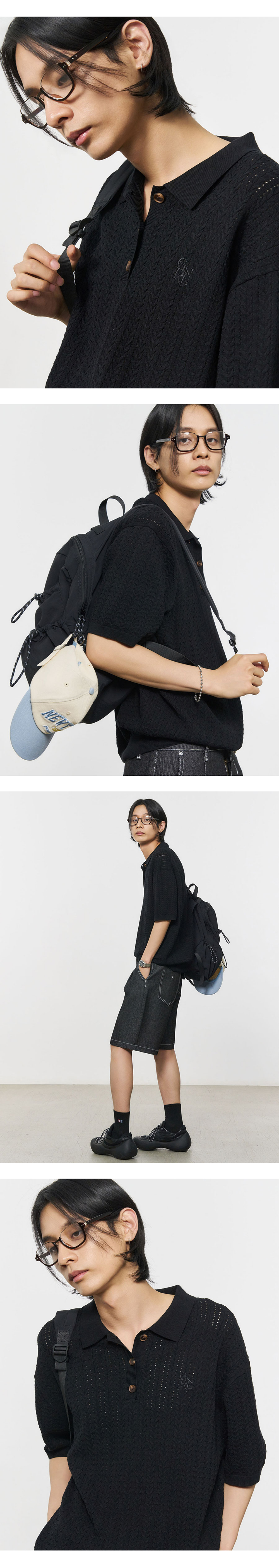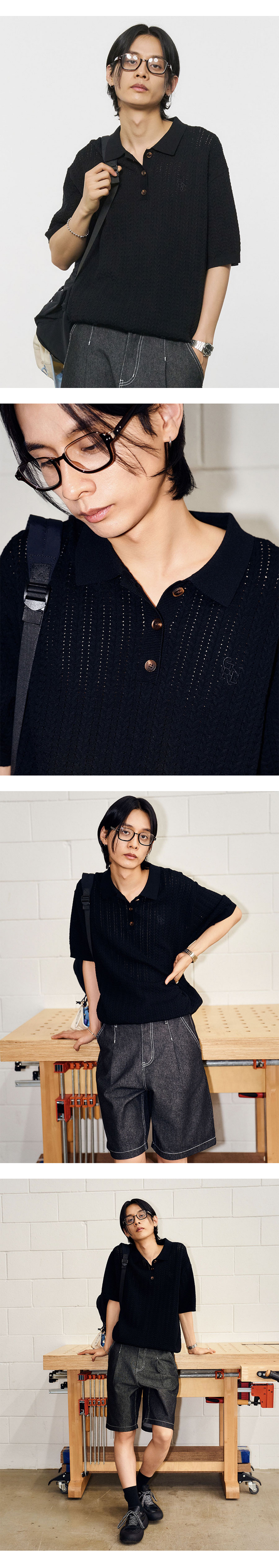 제너럴아이디어 맨 펀칭 케이블 폴로 하프 니트 블랙