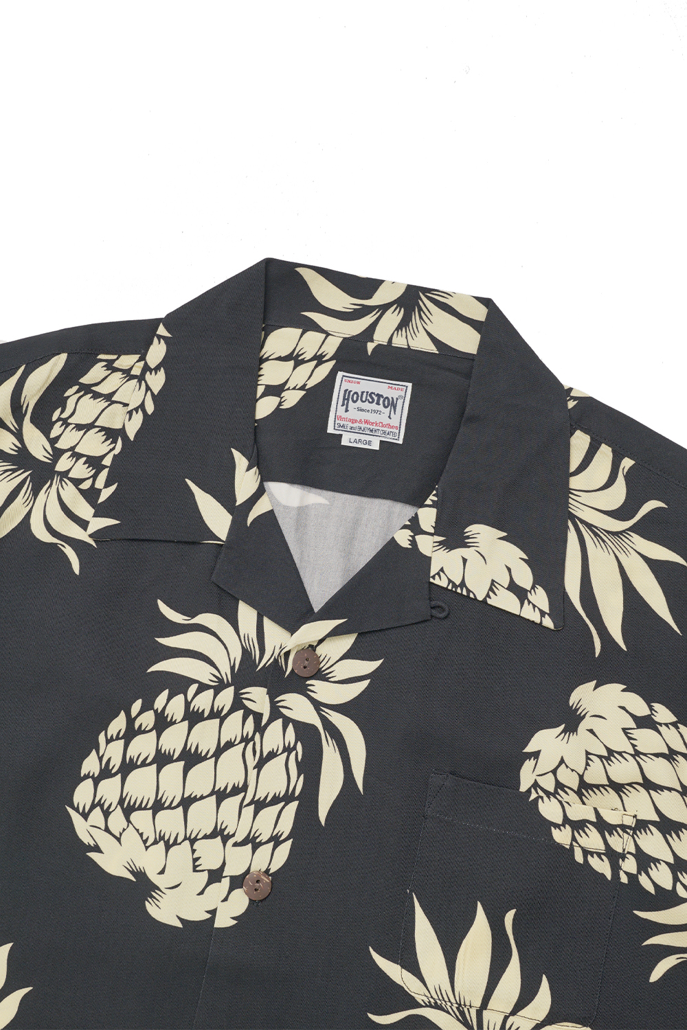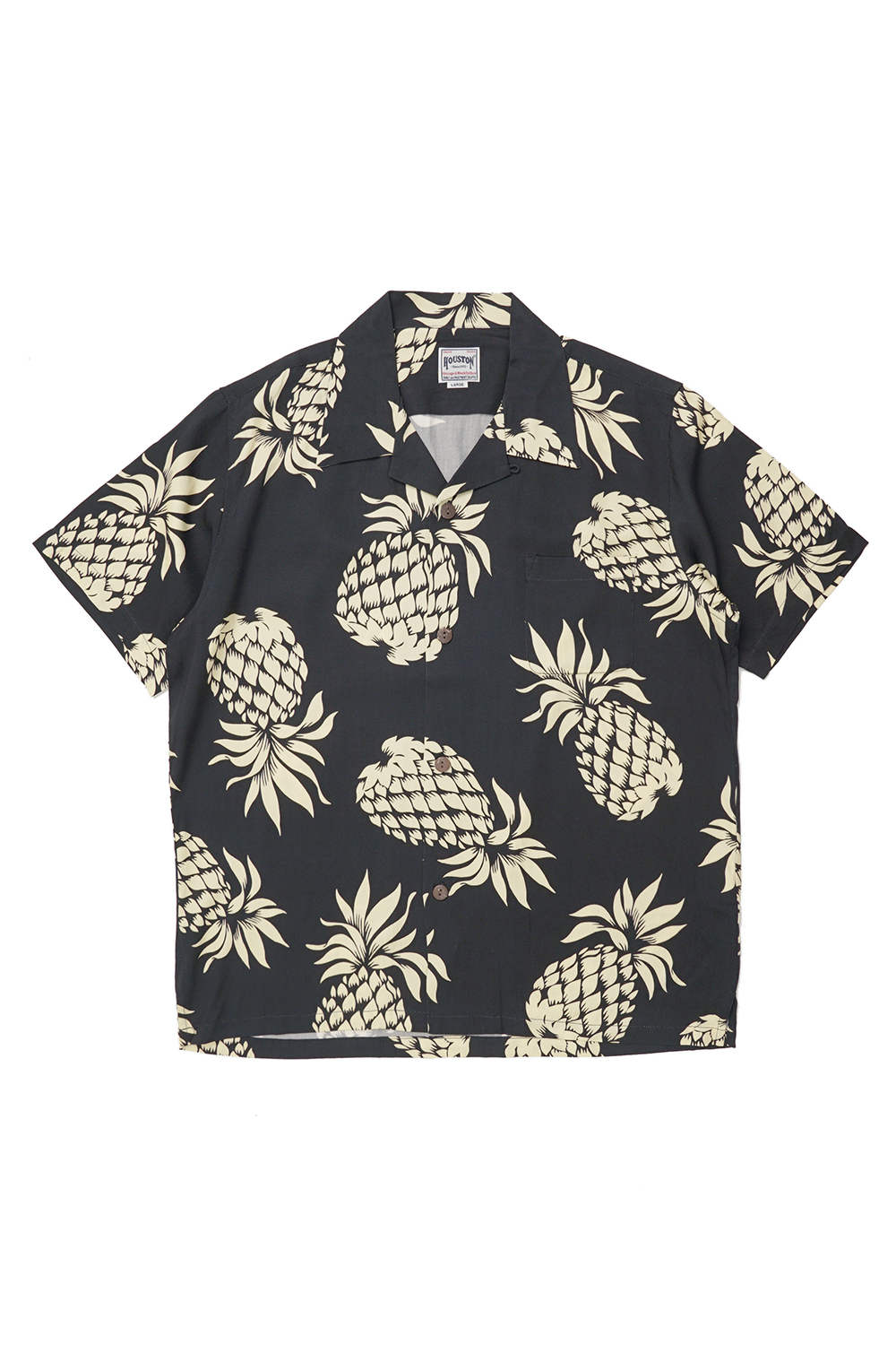 Houston Japan 41101 Aloha Shirt (Pineapple) - Black 파인애플 프린팅의 트로피칼 셔츠입니다. 오픈칼라 타입으로 레이온 소재 특유의 부드러운 촉감이 특징입니다. 코코넛 무늬의 버튼을 채용하여 남국의 무드를 연출 하였으며 프론트 좌측 포켓에는 선글라스 등 간단한 소품들의 수납이 가능합니다.