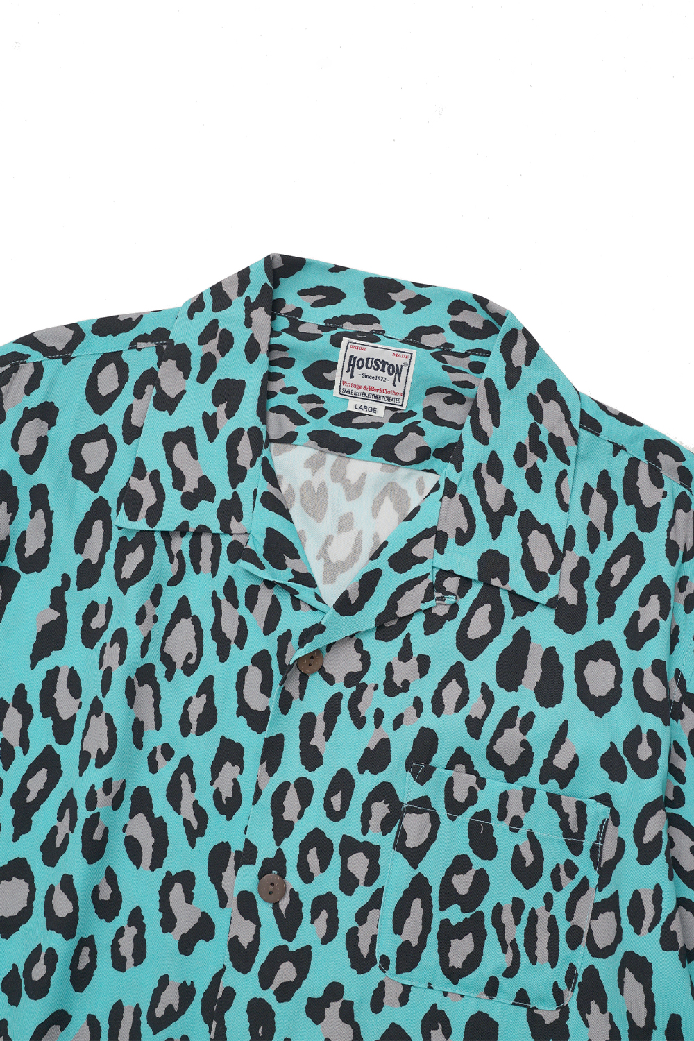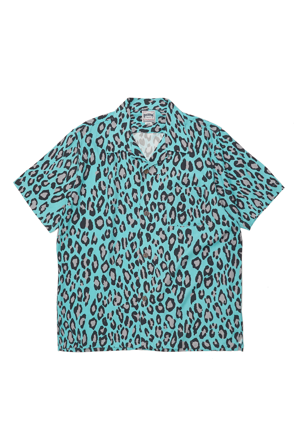 Houston Japan 41103 Aloha Shirt (Leopard) - Mint 레오파드 프린팅의 트로피칼 셔츠입니다. 오픈칼라 타입으로 레이온 소재 특유의 부드러운 촉감이 특징입니다. 코코넛 무늬의 버튼을 채용하여 남국의 무드를 연출 하였으며 프론트 좌측 포켓에는 선글라스 등 간단한 소품들의 수납이 가능합니다.