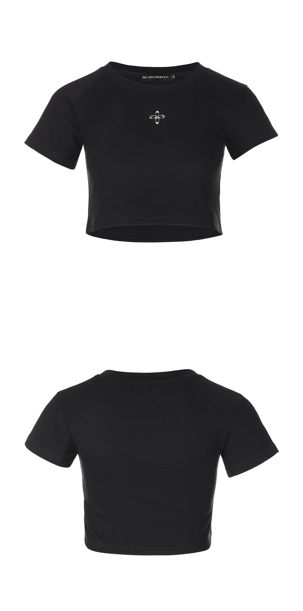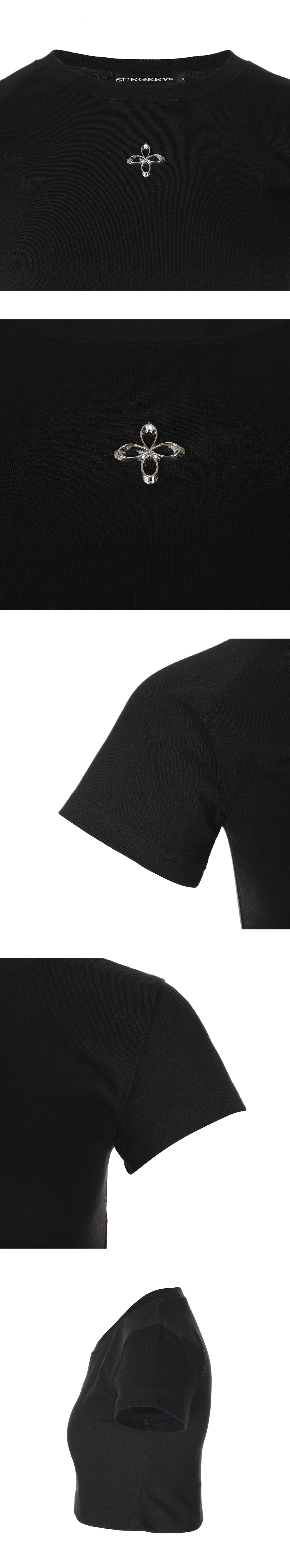 써저리 언발런스 메탈 클로버 로고 크롭 티셔츠 블랙