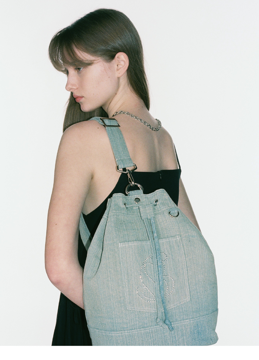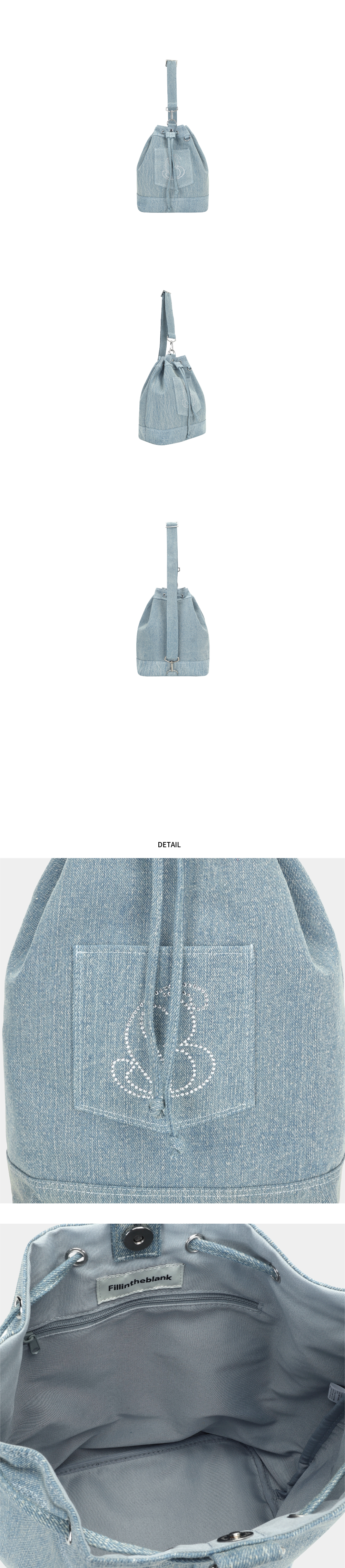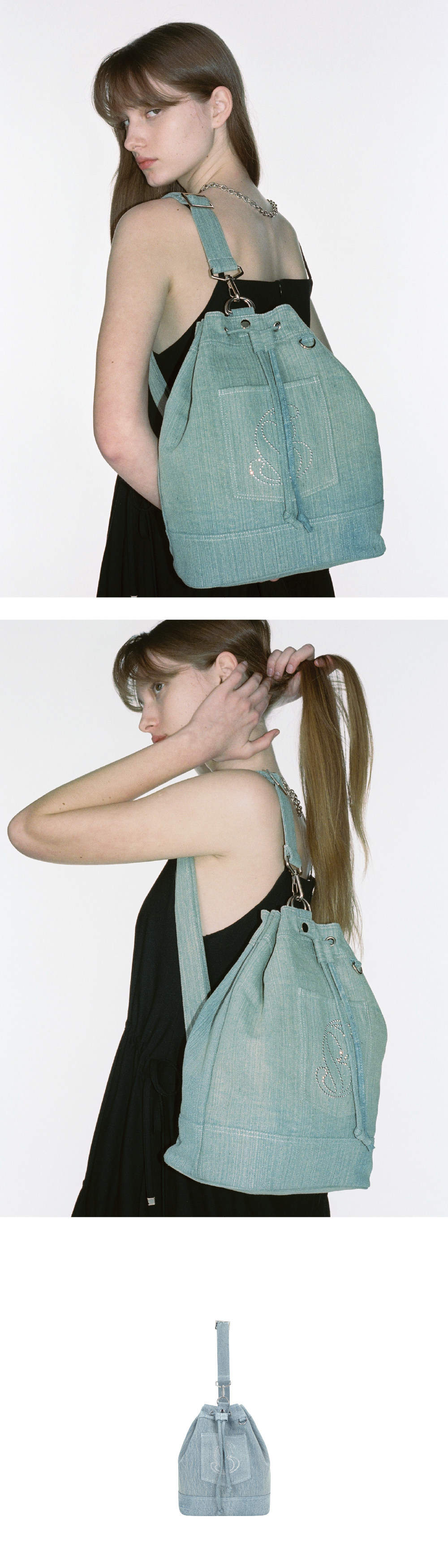 삼각 포켓 위 핫픽스 포인트, 라이트한 중량감으로 부담 없이 착용 가능한 빈티지한 텍스쳐의 데님 원단을 사용한 버킷백. (기본 구성 : 가방 본체 + 가방 스트랩 1개)