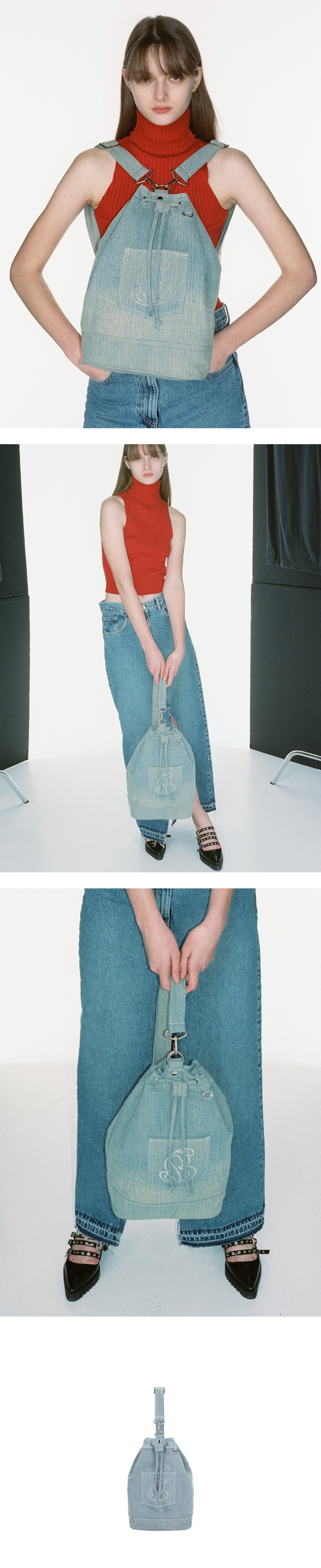 삼각 포켓 위 핫픽스 포인트, 라이트한 중량감으로 부담 없이 착용 가능한 빈티지한 텍스쳐의 데님 원단을 사용한 버킷백. (기본 구성 : 가방 본체 + 가방 스트랩 1개)