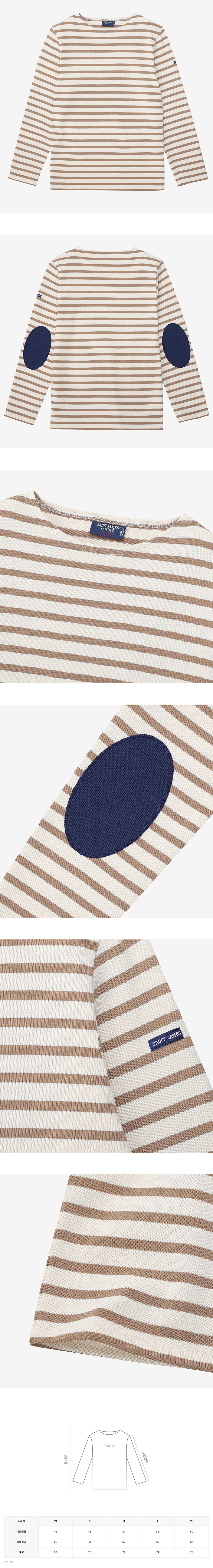 롱 슬리브 라운드넥의 약간 도톰한 면 소재인 메르디앙에 배색 컬러의 팔꿈치 패치가 덧대어진 스타일. 루즈한 핏의 유니섹스 스타일로 왼쪽 팔에 세인트 제임스 로고 패치가 붙어 있다.