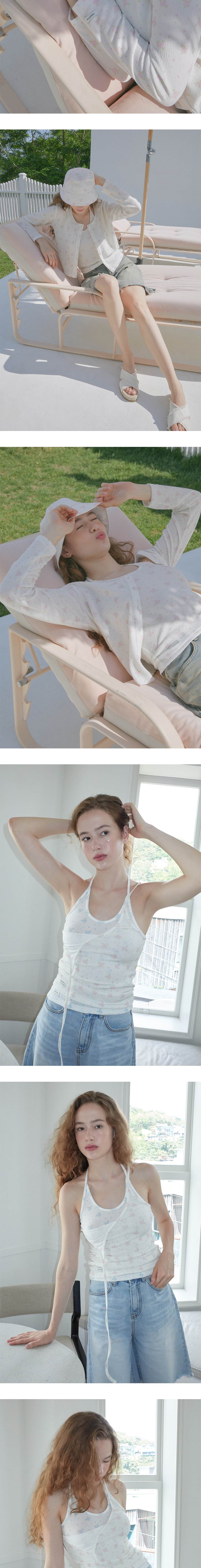 Margarin fingers 24 summer 플로럴 홀터 탑입니다. - 직접 개발한 시그니처 플라워 패턴의 프린트 다이마루 소재 - 끈을 원하는 기장에 맞춰 묶을 수 있는 홀터 탑 - 신축성이 뛰어나 편안하게 몸에 핏되는 실루엣 - 앞판 포인트 라벨