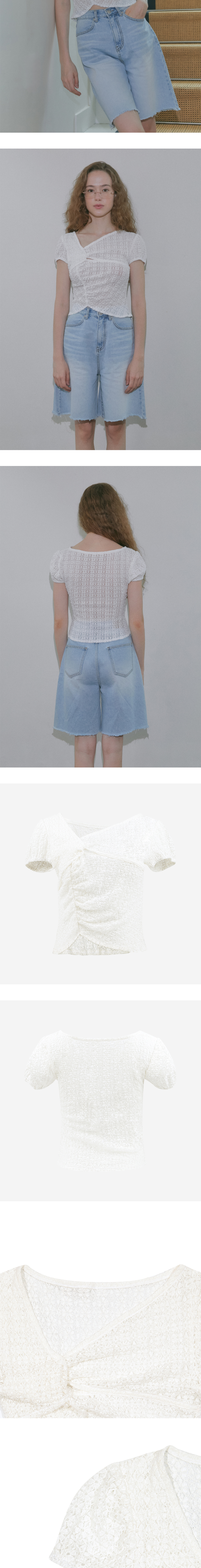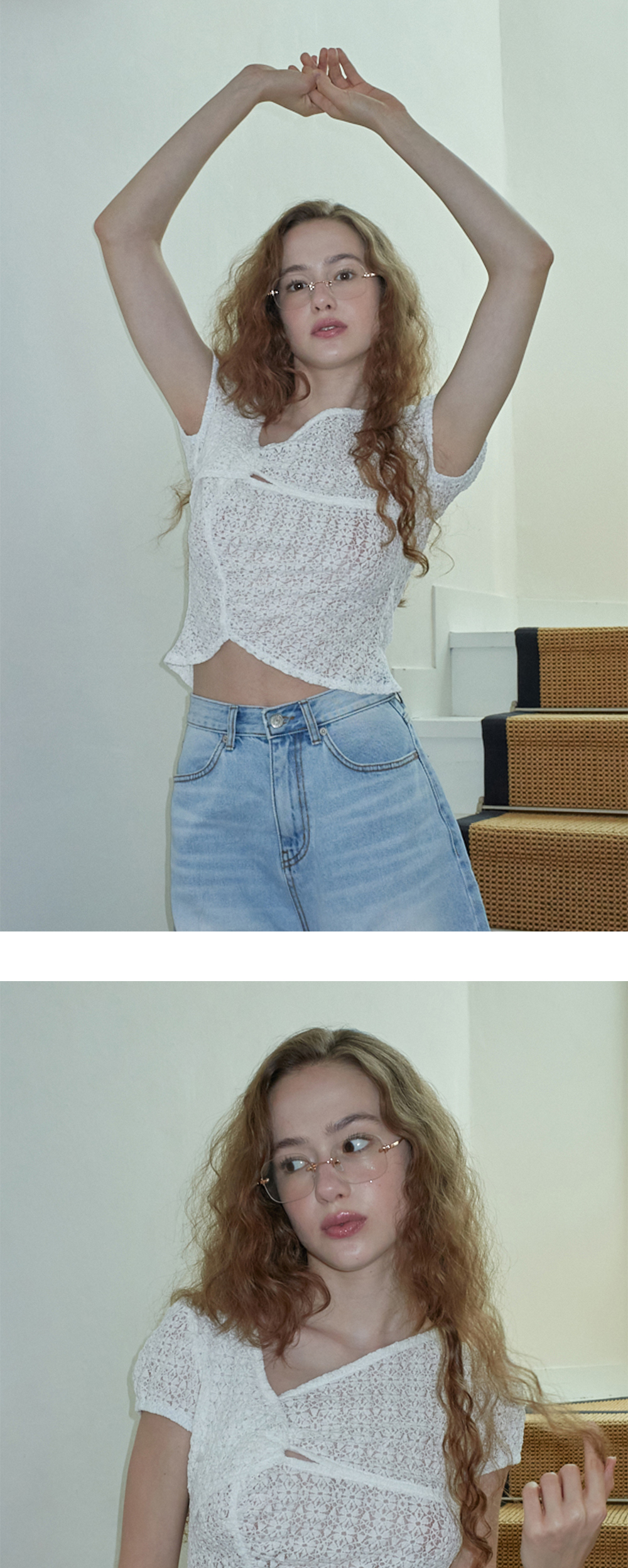Margarin fingers 24 summer 레이스 드레이프 탑입니다. - 신축성이 있는 플라워 패턴의 레이스 소재 - 소매 전체 밴딩으로 편안한 착용감 - 앞판 드레이핑 꼬임 포인트와 절개라인 따라 셔링 디테일 - 비대칭으로 떨어지는 라운드 밑단 디테일