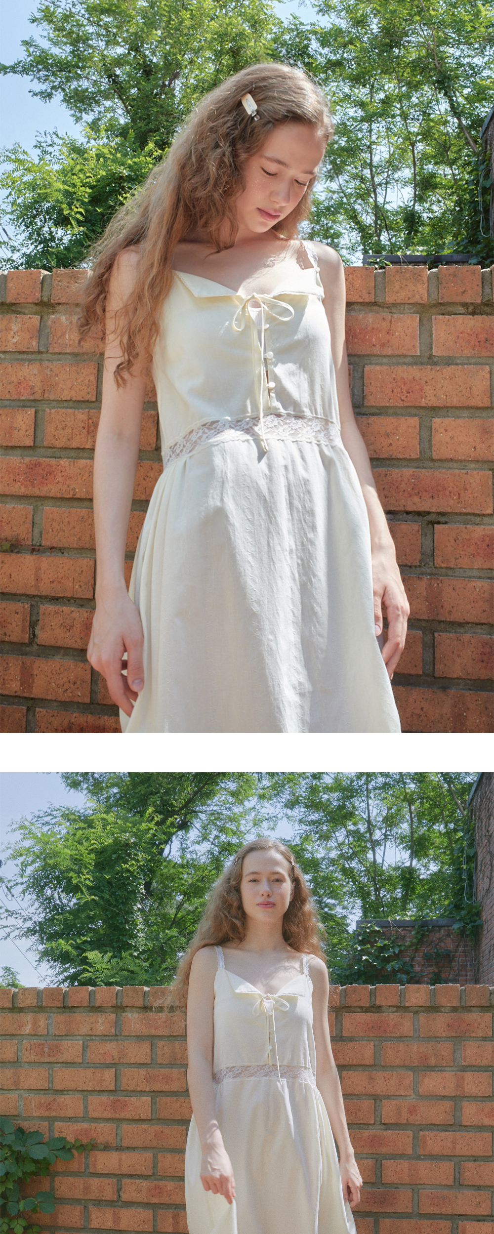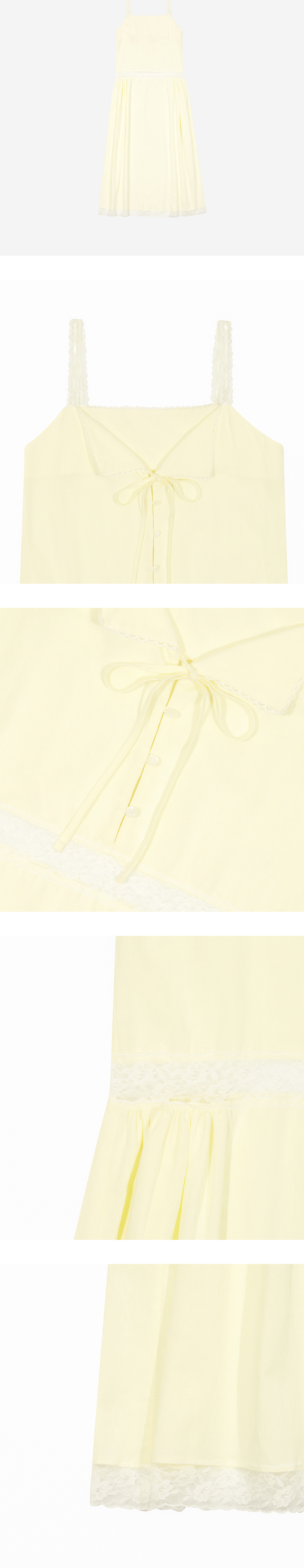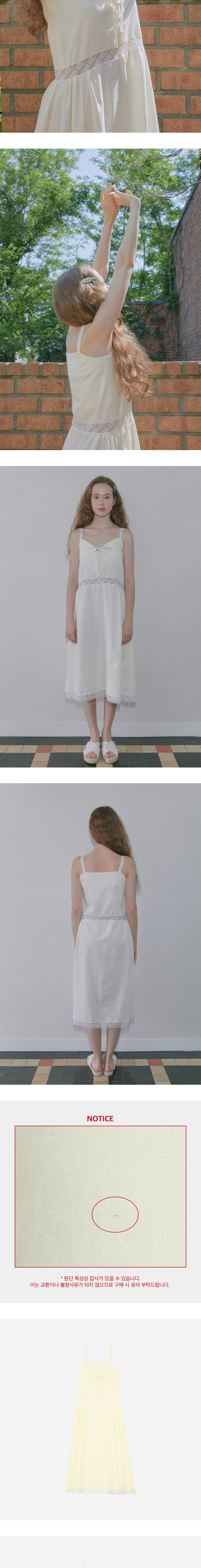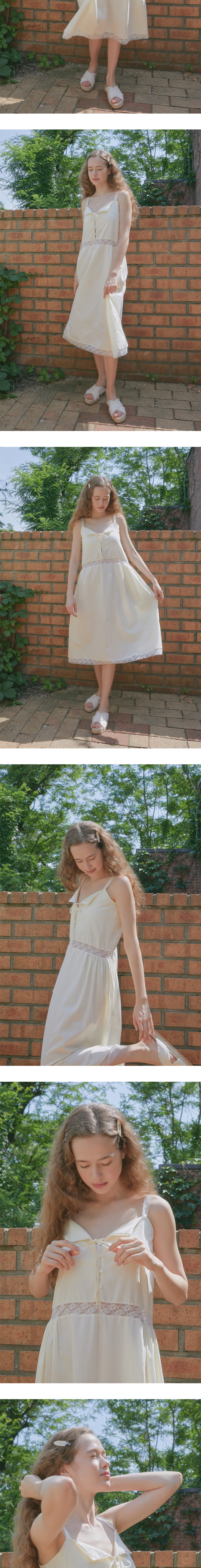 Margarin fingers 24 summer 레이스 벨 롱 원피스입니다. - 은은한 자수 디테일의 면 소재 - 단독 또는 레이어드로 다양한 스타일링 가능 - 앞판 리본 여밈 포인트 - 어깨끈, 넥 라인, 허리, 밑단 총 3가지 레이스 사용