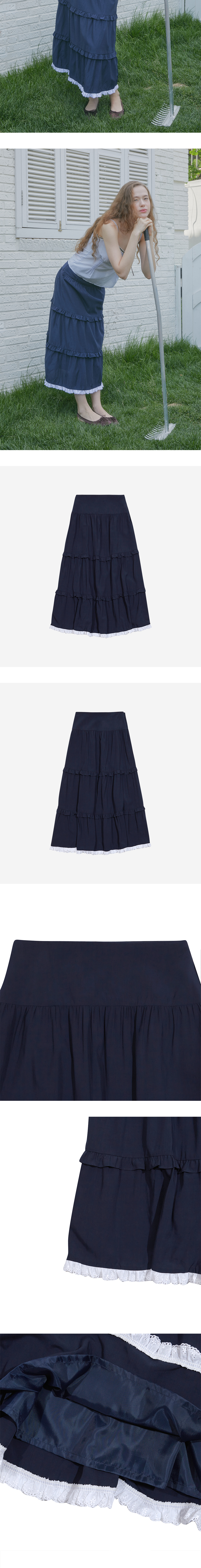 Margarin fingers 24 summer 프릴 롱 스커트입니다. - 시어한 얇은 소재 사용 - 단 사이 프릴 디테일 - 밑단 배색 레이스 트리밍 포인트 - 사이드 콘솔 지퍼 오픈 클로징