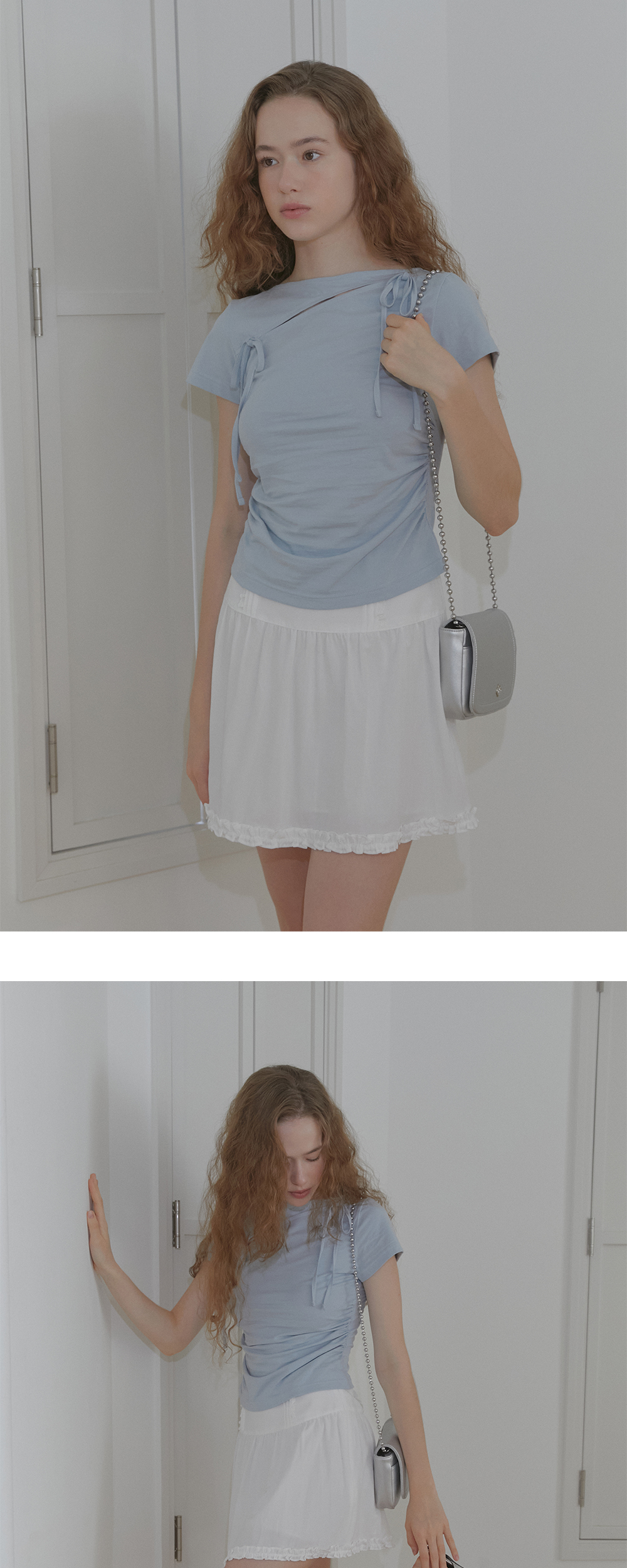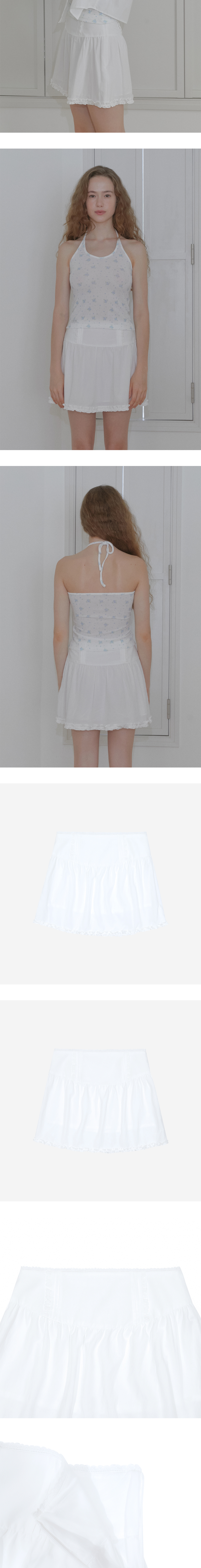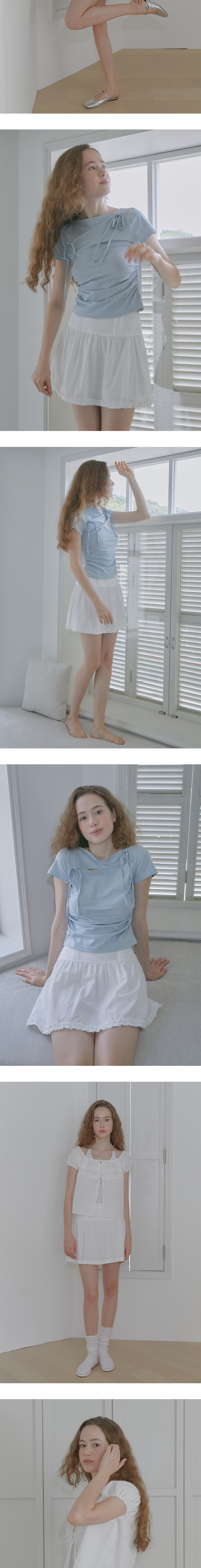 Margarin fingers 24 summer 레이스 핀턱 스커트입니다. - 얇은 면 소재의 A 라인 미니 스커트 - 세로 핀턱, 레이스 트리밍 디테일 - 라운드 절개 라인과 셔링 디테일 - 밑단 프릴 포인트 - 비침 방지 안감 사용