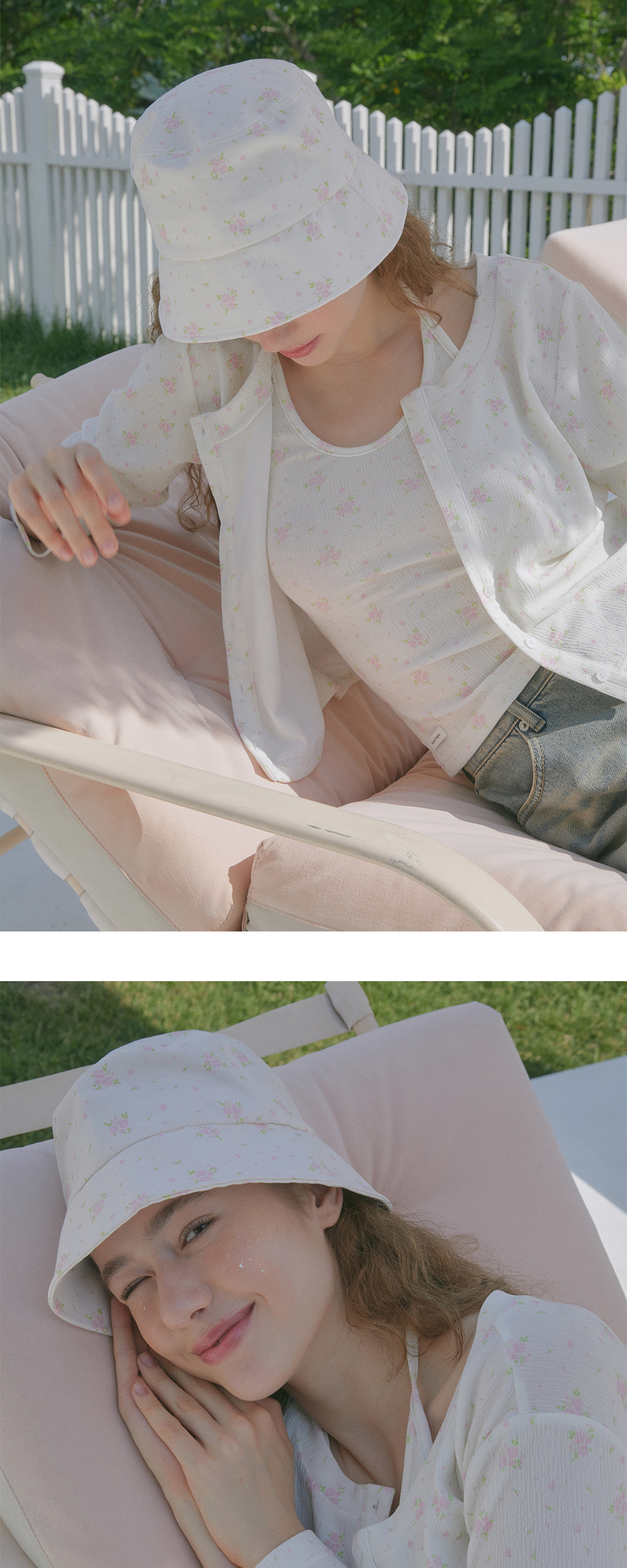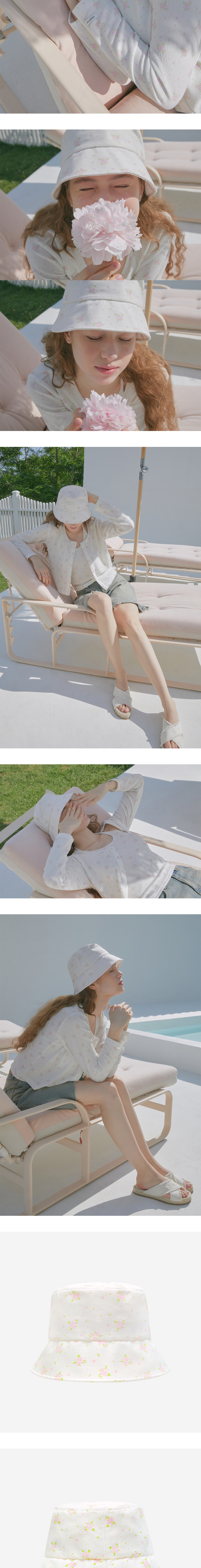 Margarin fingers 24 summer 플로럴 버킷햇 입니다. - 직접 개발한 시그니처 플라워 패턴의 프린트 소재 - 베이직한 핏의 챙이 약간 짧은 버킷 햇 - 가볍고 적당한 두께감의 트윌 면 소재를 사용하여 썸머 시즌에도 덥지 않게 착용 가능