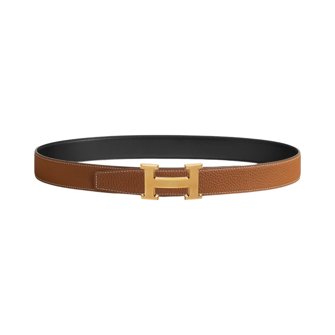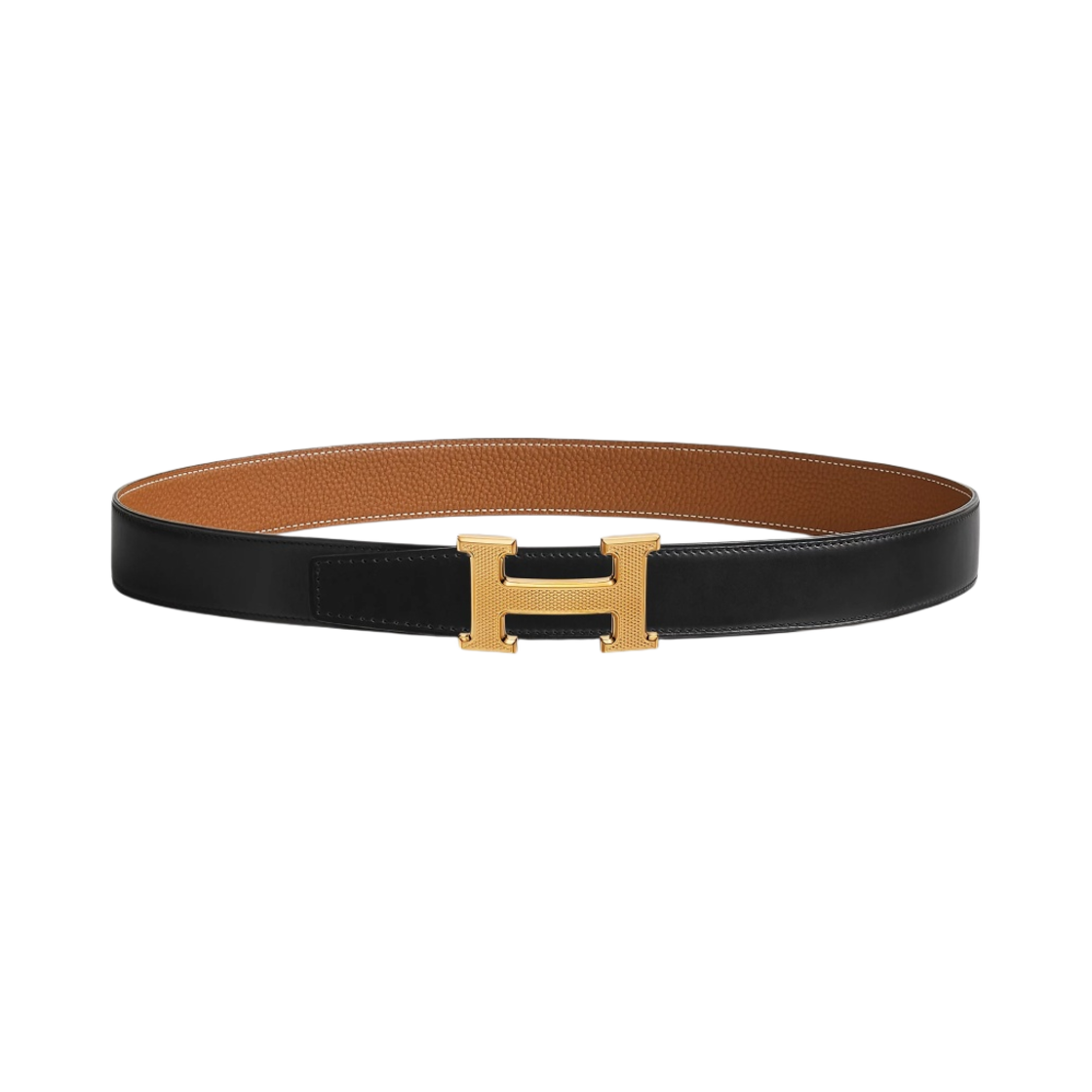 Hermes H Guillochee Belt Buckle & Reversible Leather Strap 32mm & Gold Noir Gold