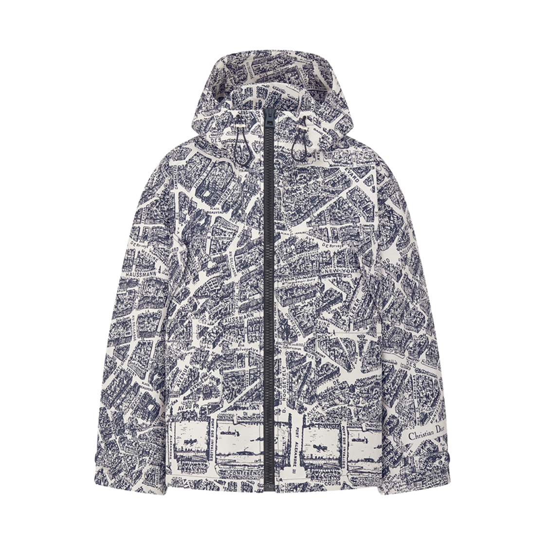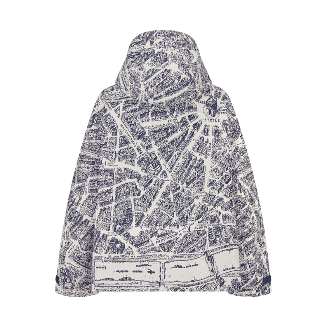 (W) Dior Hooded Anorak White Navy Blue Technical Taffeta Jacquard Plan Paris Motif