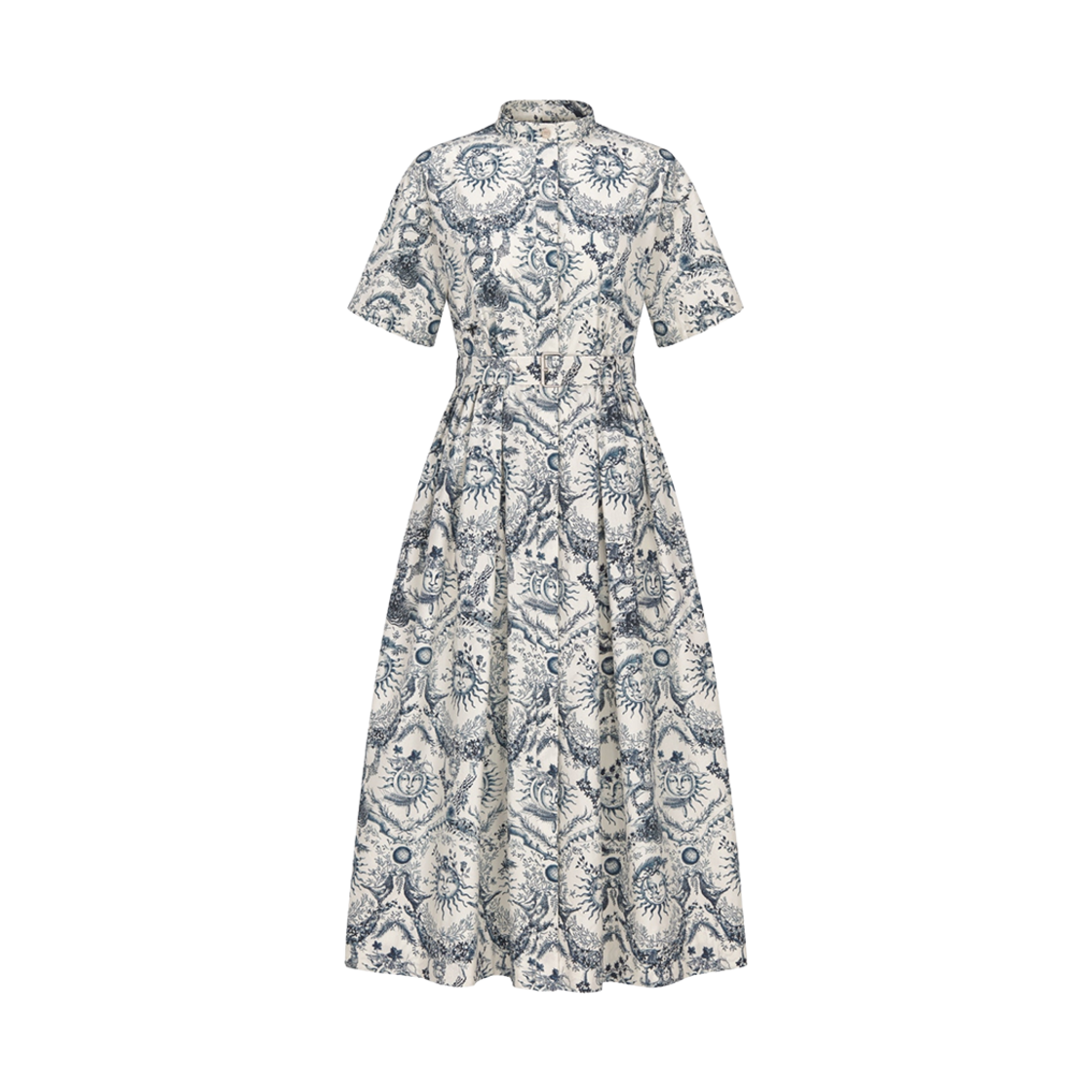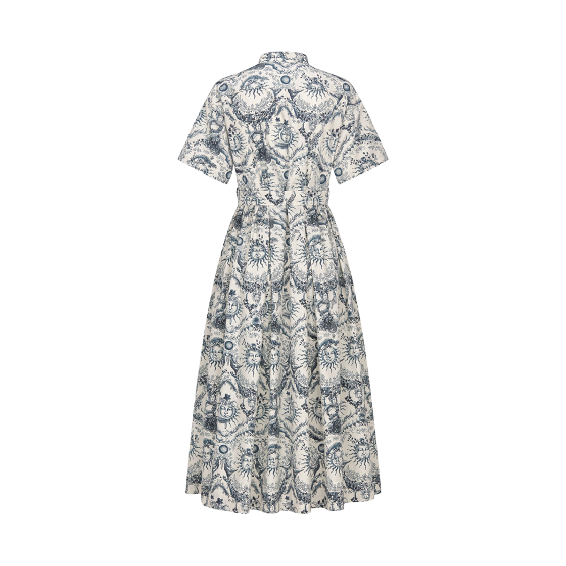 (W) Dior Mid-Length Shirt Dress Navy Blue White Silk Cotton Poplin Toile Soleil Motif
