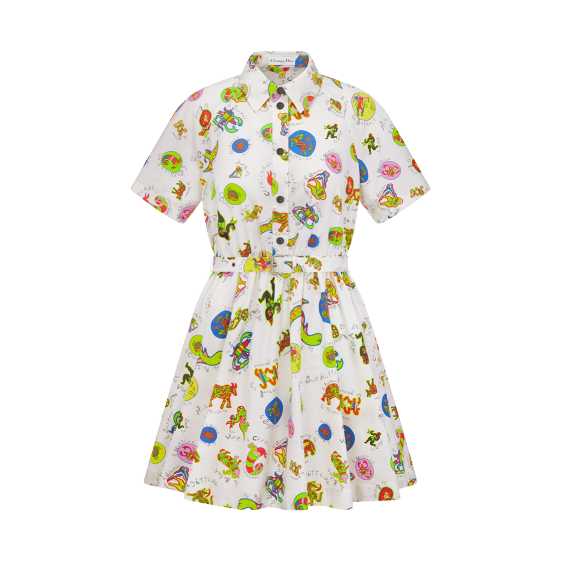(W) Dior Belted Shirt Dress White Silk Twill Multicolor Dragon Zodiac Motif