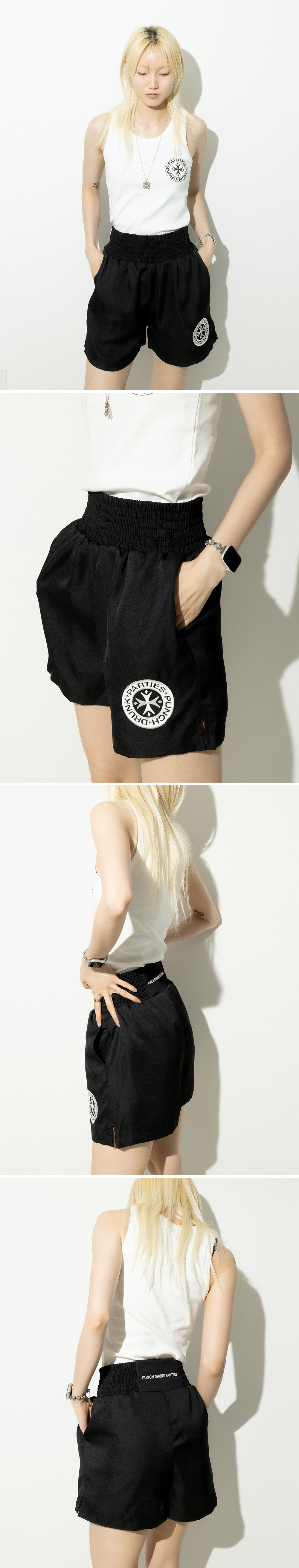 오일리한 표면의 나일론 원단으로, 얼룩이 진듯한 텍스쳐에서 오는 광택감이 있습니다. 복싱 쇼츠를 베이스로 제작된 제품이며 수영복으로 활용 가능합니다. - 100% Poly - Boxer Shorts Silhouette - Swimshorts Size Guide Female / 174cm, 55kg, Size 2