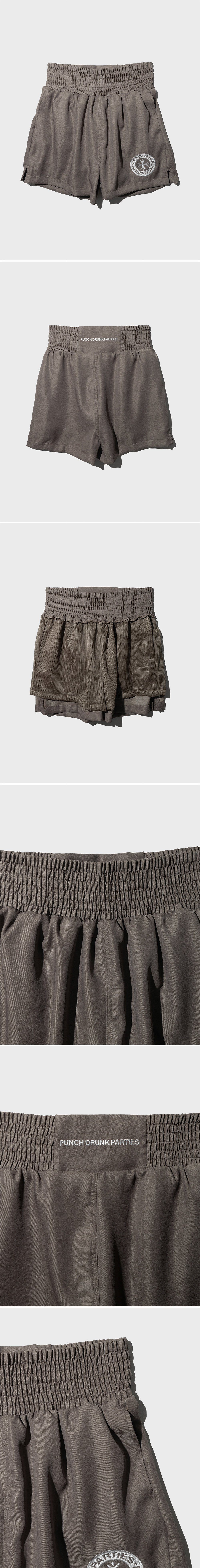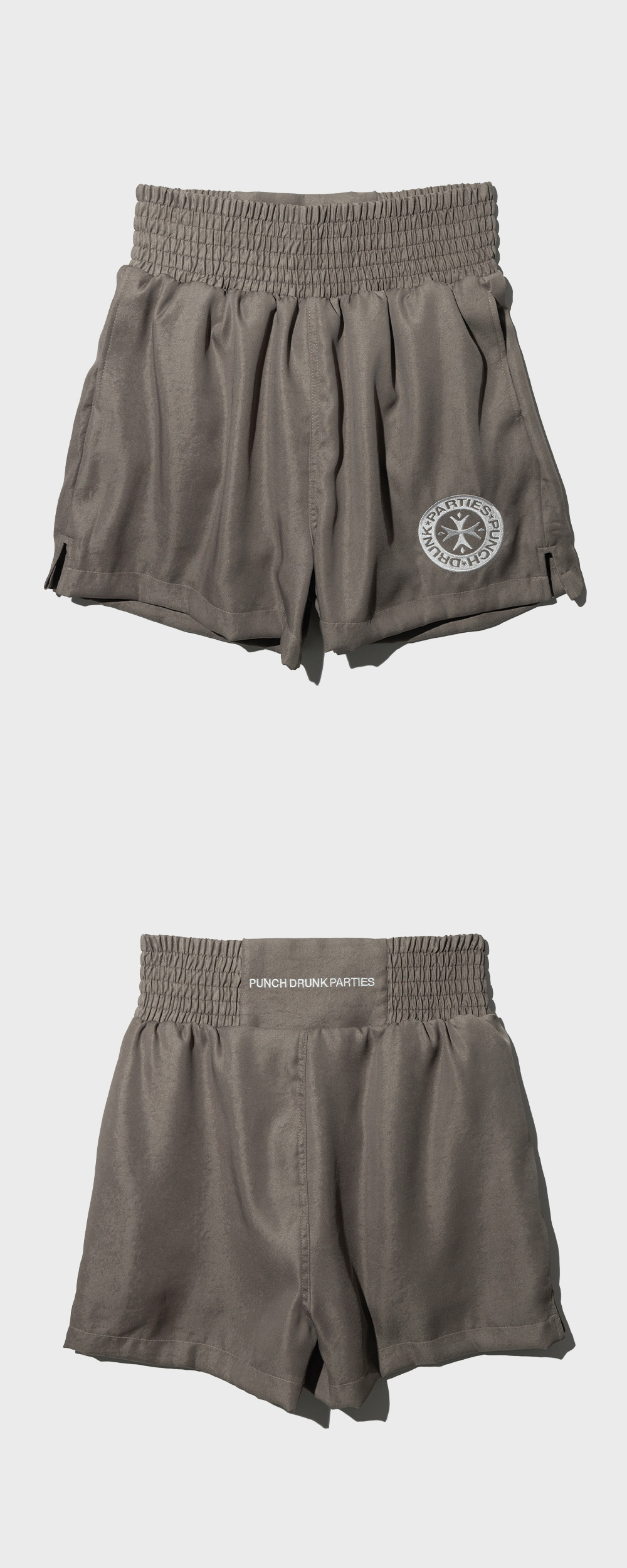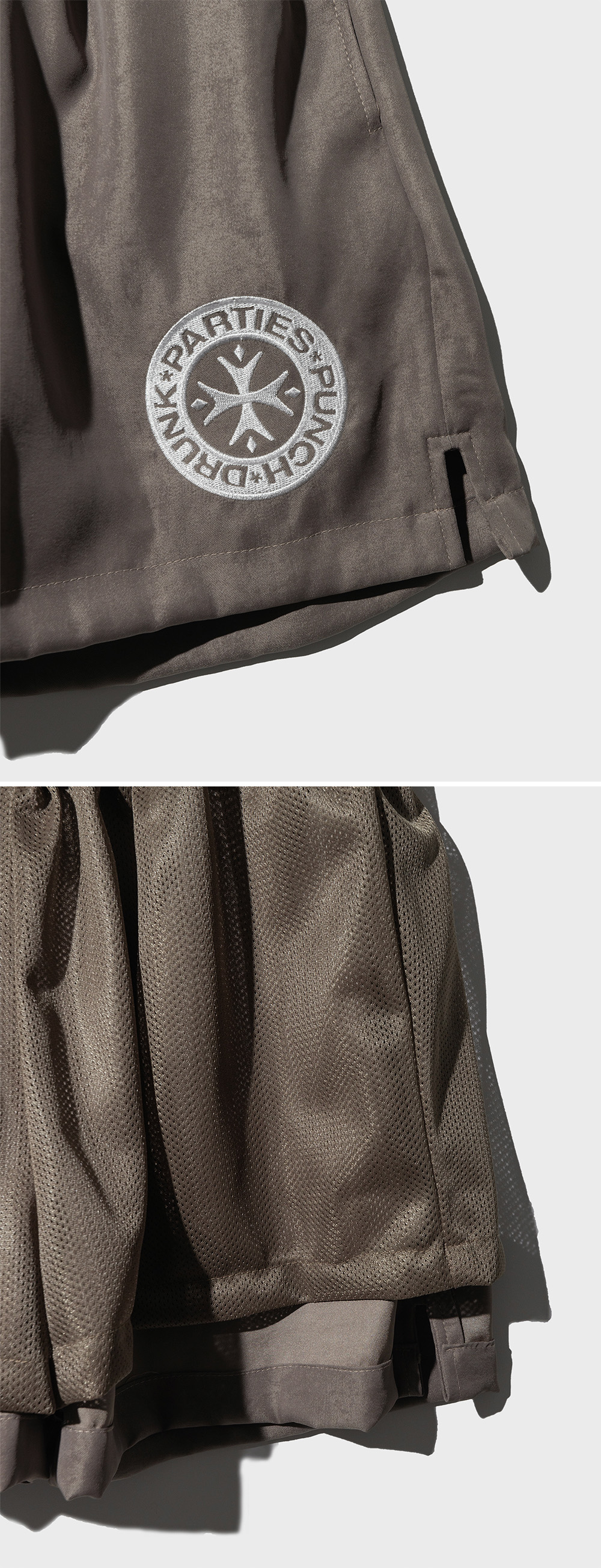 오일리한 표면의 나일론 원단으로, 얼룩이 진듯한 텍스쳐에서 오는 광택감이 있습니다. 복싱 쇼츠를 베이스로 제작된 제품이며 수영복으로 활용 가능합니다. - 100% Poly - Boxer Shorts Silhouette - Swimshorts