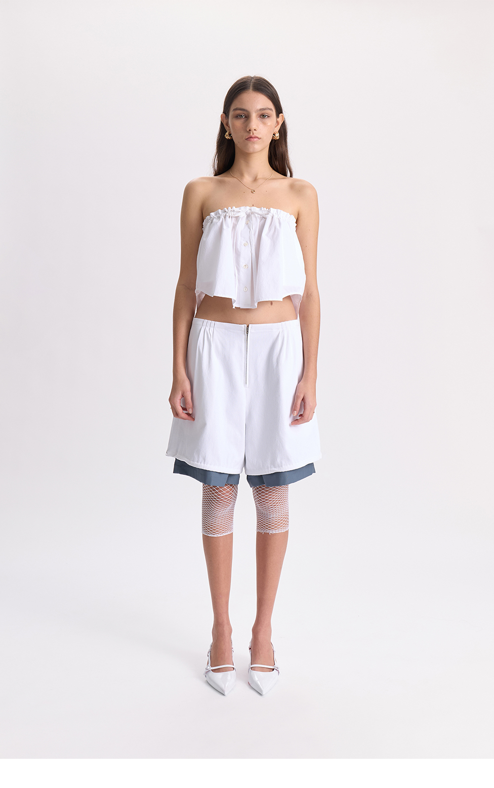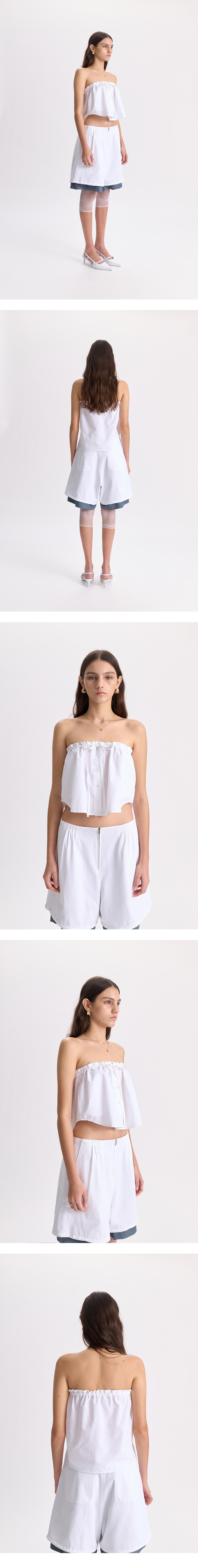 - 탑, 스커트로 다양한 스타일링이 가능한 아이템<br><br> - 상단 끈으로 사이즈 조절 가능<br> - 끈 상단 러플 디테일<br> - 착용하는 정도의 따라 다양한 실루엣 연출 가능<br><br> * Shell : 100% Cotton<br> * Made in Korea<br><br> * Model - 176cm / 58kg / One Size<br>