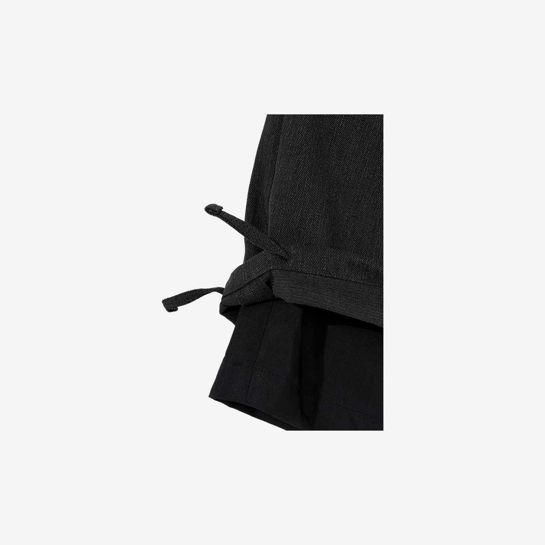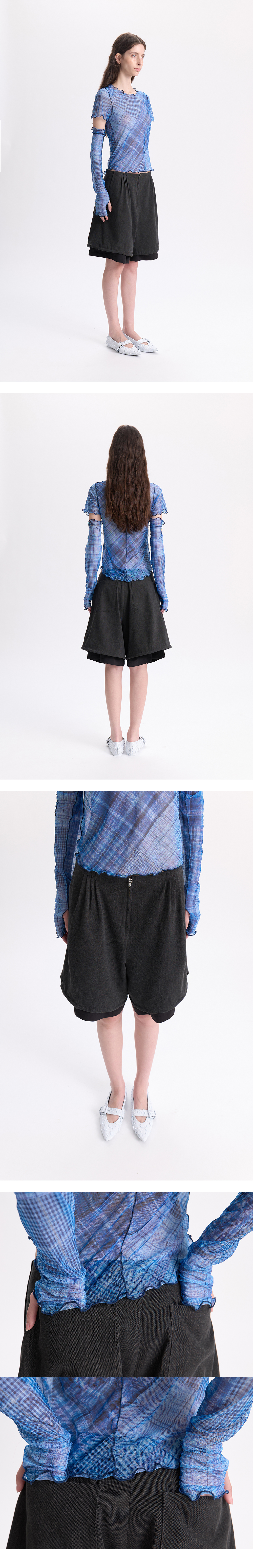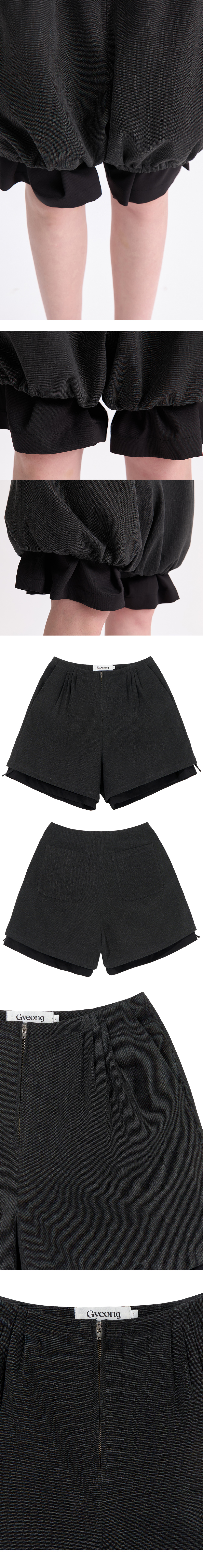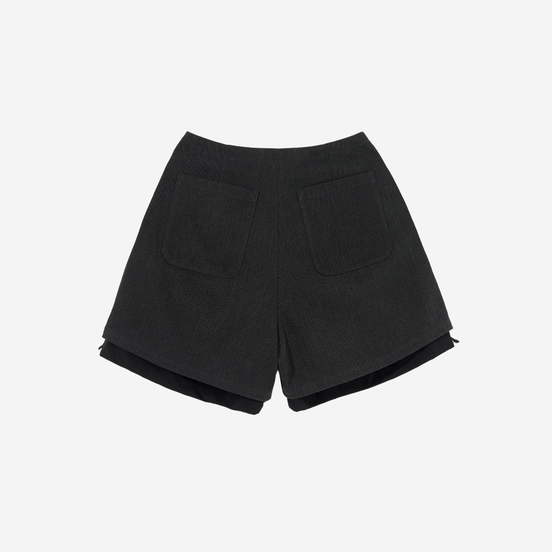 - 전체 안감이 레이어드된 형태의 쇼츠 <br><br> - 상단 턱 디테일<br> - 밑단 끈 디테일로 다양한 연출 가능<br> - 전면 2개의 포켓<br> - 후면 2개의 포켓<br> - 편안한 착용감의 레귤러핏의 실루엣<br><br> * Shell : 100% Cotton<br> * Lining : 61% Polyseter 35% Bamboo 4% Polyurethane<br><br> * Made in Korea<br><br> * Model - 176cm / 58kg / 2 Size<br>