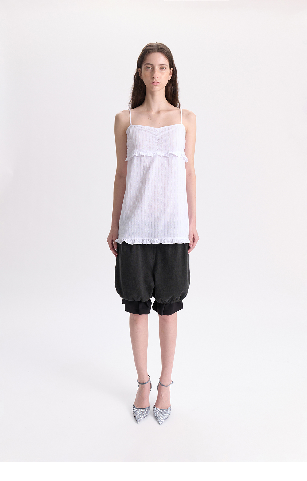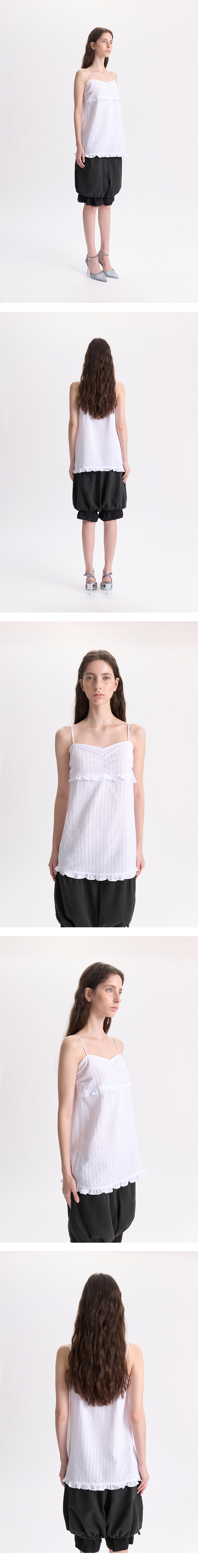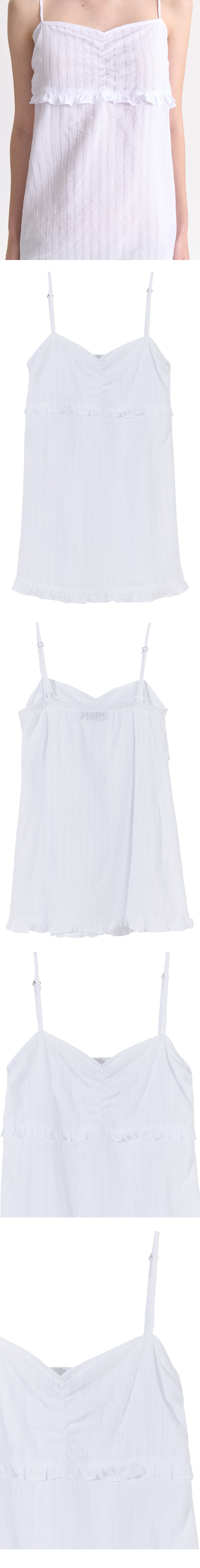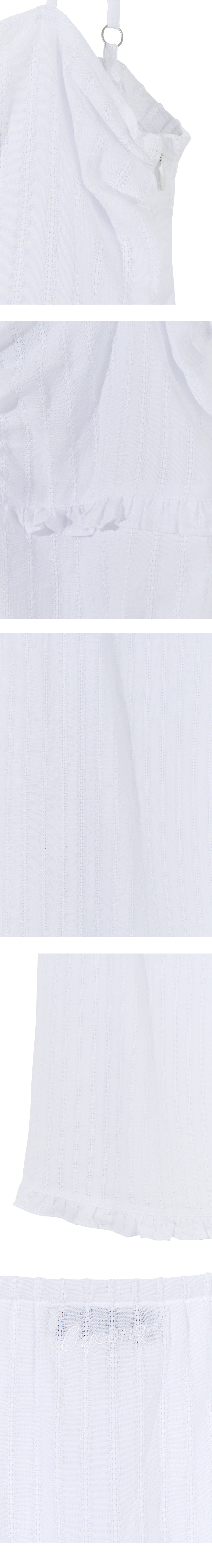 - 펀칭디테일의 슬리브리스 탑<br><br> - 어깨끈 조절이 가능한 고리 부착<br> - 바스트 하단, 밑단 러플 디테일<br> - A라인의 실루엣<br><br> * Shell : 100% Cotton<br> * Made in Korea<br><br> * Model - 176cm / 58kg / 2 Size<br>