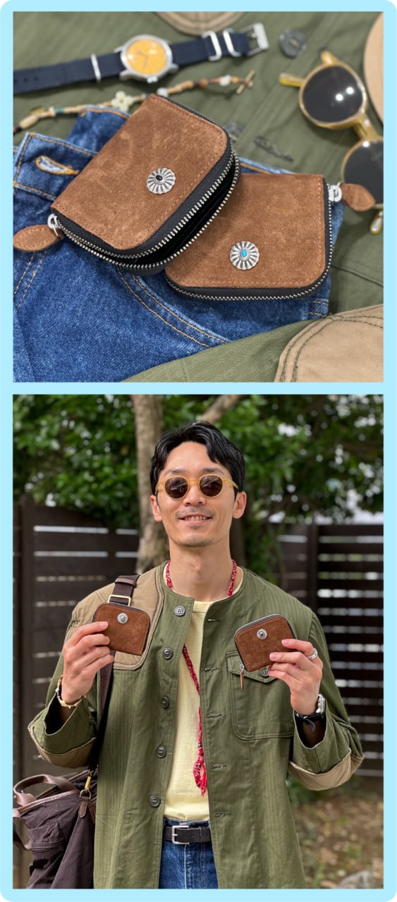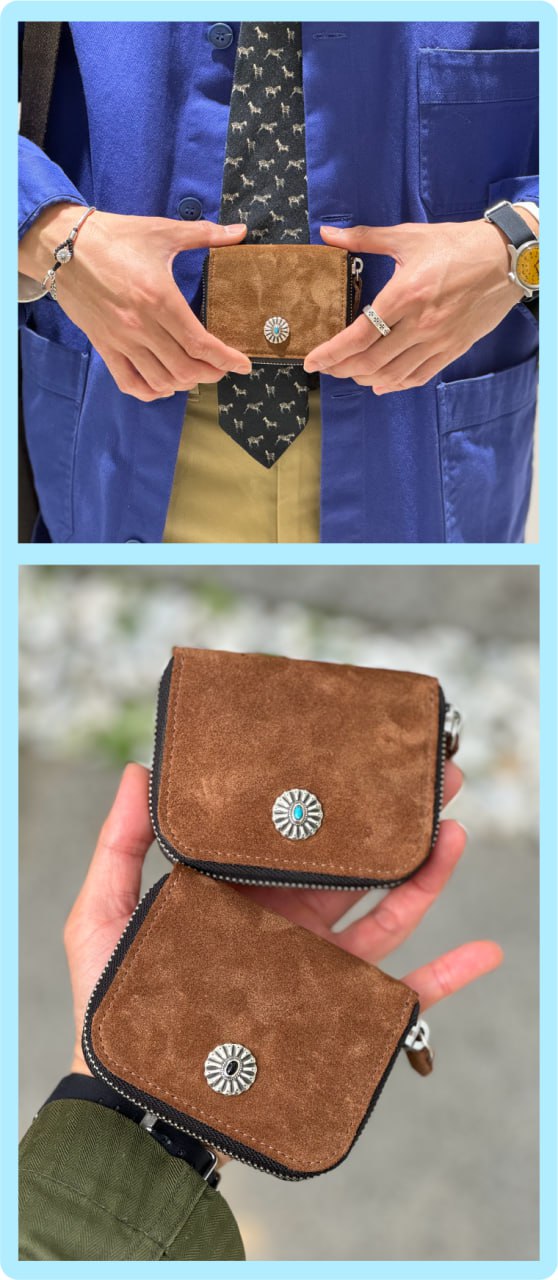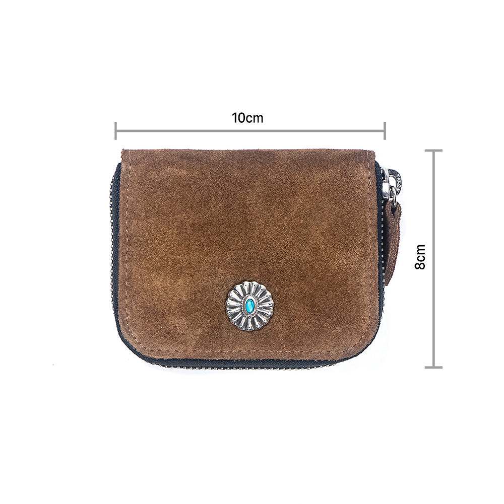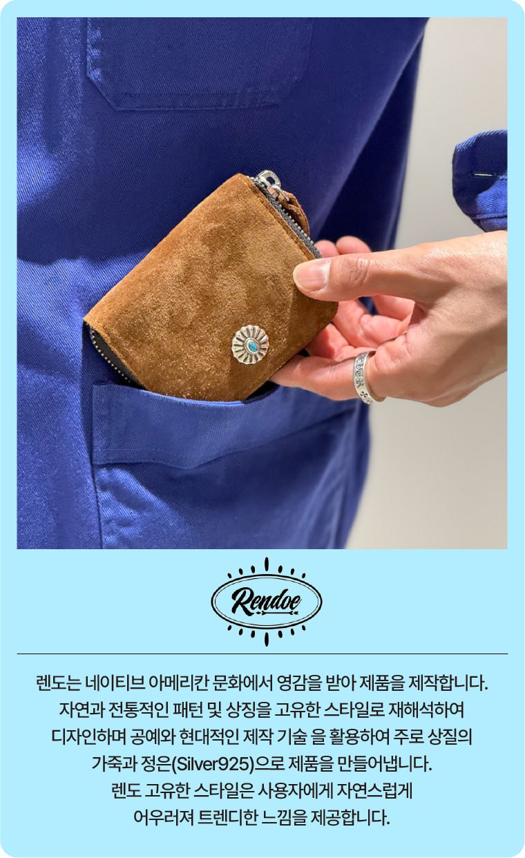 스웨이드를 사용해 컴팩트하게 제작된 지퍼지갑입니다. 콘초는 네이티브 아메리칸 문화에서 영감을 받아 제작된 콘쵸입니다. Clam Turquoise Concho는 조개를 형상화하고, 터키큐빅을 세팅함으로써 네이티브 아메리칸 주얼리적인 요소를 담아내었습니다. 안감가죽 베지터블 가죽만의 에이징되어지는 느낌도 표현하고 일상생활에 불편한 베지터블 가죽의 단점들을 케어한 타입이며 천연 소가죽의 내츄럴한 무드를 표현하였습니다. 겉감 가죽 이태리 카프스웨이드 " italy calf suede " 천연가죽원지중 가장 고급으로 들어가는 카프원지를 사용한 스웨이드입니다, 이태리 현지의 오롯이 스웨이드만 생산하는 전문적인 태너리에서 생산된 가죽으로 카프 원지의 혁질이 잘 표현되었으며 스웨이드 쉐이빙 가공으로 고운 표면 터치를 느낄 수 있습니다. 추가로 스웨이드 가죽의 전형적인 특징인 물 빠짐을 최소로 방지하기 위해 발수코팅 작업을 추가하였습니다.
