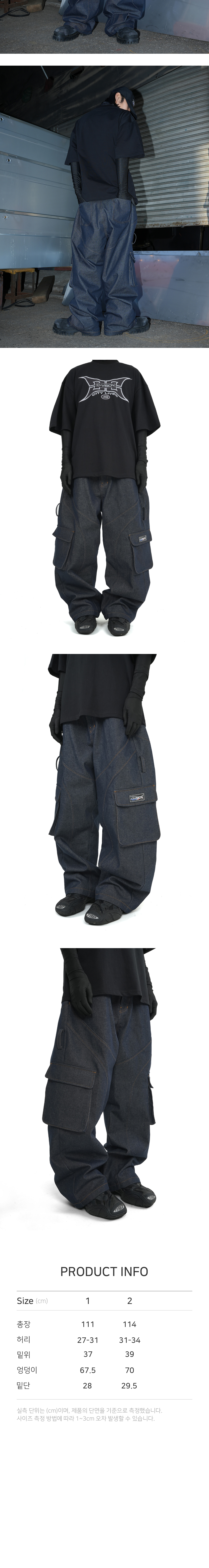 [PRODUCT INFORMATION] 제조국: 한국 (Made in KOREA) 소재: 코튼 100% (Cotton 100%) -라지 와이드 핏 (Large wide fit) -이염과 탈색을 최소화 한 논페이드 데님 (Nonfade denim) -앞면과 뒷면의 패널 구조 (Panels at front and back) -2개의 카고 포켓 (2 Cargo Pockets) -2개의 슬래시 포켓과 2개의 패치 포켓 -시즌 슬로건 고무 라벨 (Season slogan rubber label) -옆면의 벨트 루프 장식 -2개의 비조를 이용한 허리 조절 (Side adjusters at waist band) [Model Spec & Size] Man model is 184cm, and wearing a Size 2