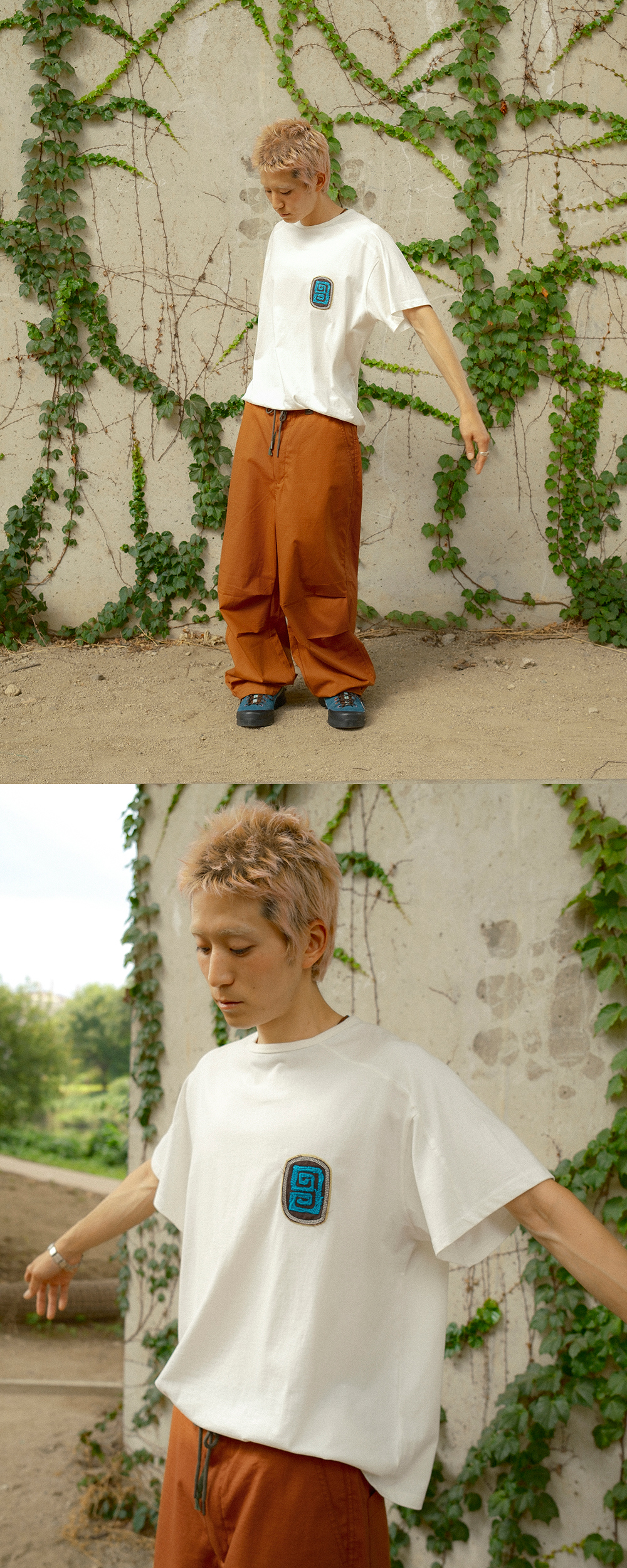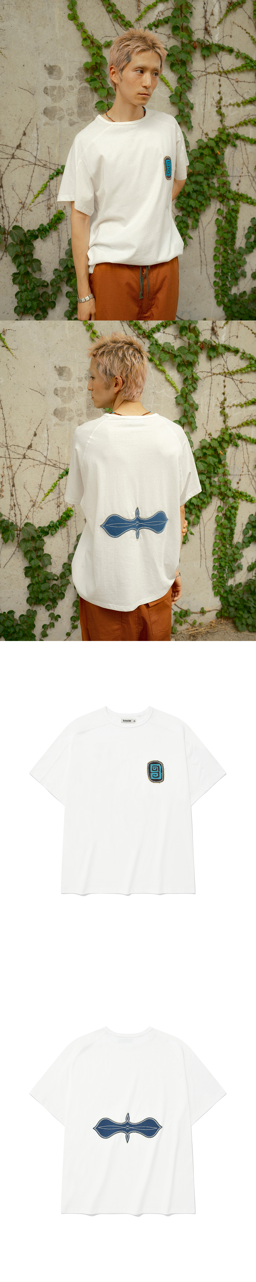 Product Info. - 워싱 공정을 거쳐 소프트한 스킨십의 20's 코튼 소재로 제작된 반팔 티셔츠 - 적당한 오버사이즈드 핏으로 편안하고 여유로운 착용감 - 구조적인 패턴 변형을 통하여 자연스럽게 떨어지는 어깨라인 - 전면 일반 암홀과 달리 후면 래글런 소매 구조로 용이한 활동성 - 전면 입체적인 형태의 밀도 높은 로고 자수 포인트 - 후면 허리부 빈티지 웨스턴 무드의 패치워크 자수 포인트