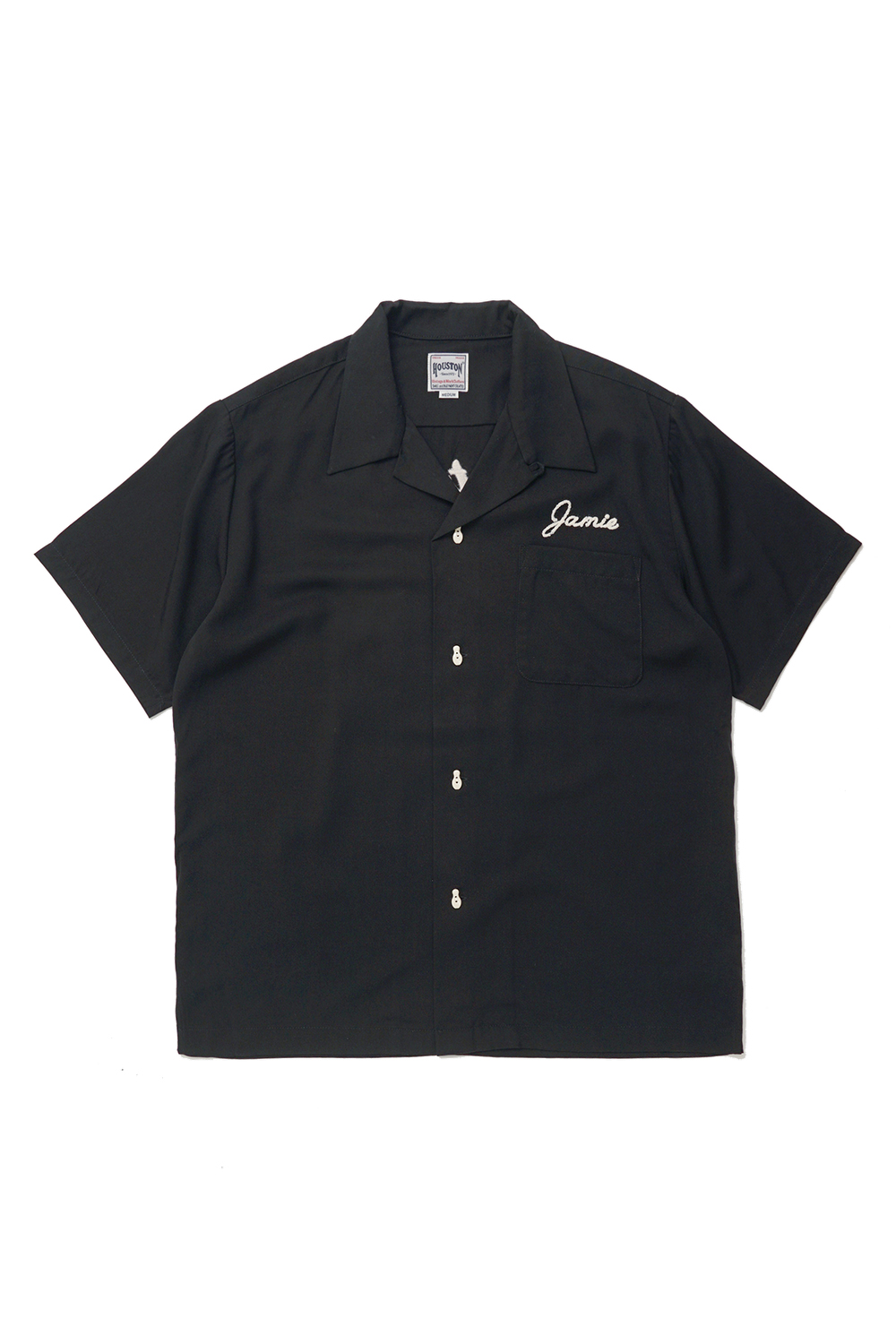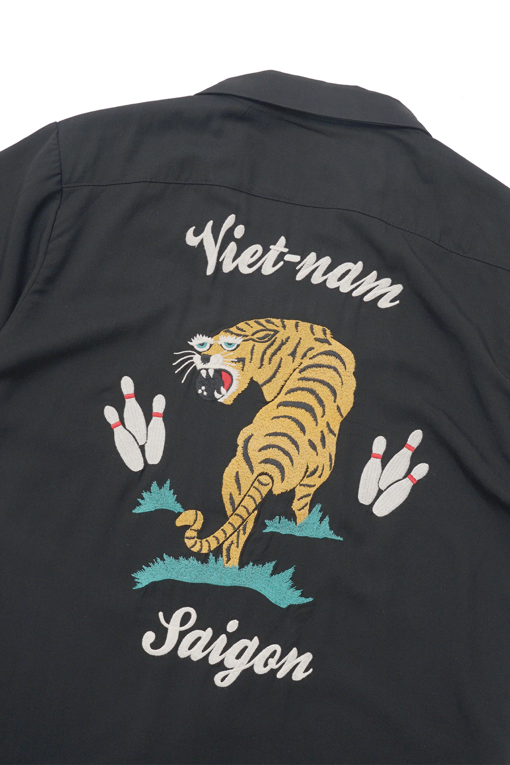 Houston Japan 41096 Bowling Shirt (Vietnam) - Black 휴스턴 재팬의 썸머 스테디 셀러 아이템 '볼링 셔츠'입니다. 소재는 레이온을 사용하여, 부드러우면서도 은은한 광택이 특징입니다. 목 부분은 오픈카라 형태이며, 포켓의 상단에는 네임자수가 놓여있습니다. 프론트에는 볼링핀 디자인의 유니크한 버튼을 채택하였습니다. 또한 후면부의 중앙에는 볼링핀과 호랑이의 일러스트가 디자인 되어있습니다.