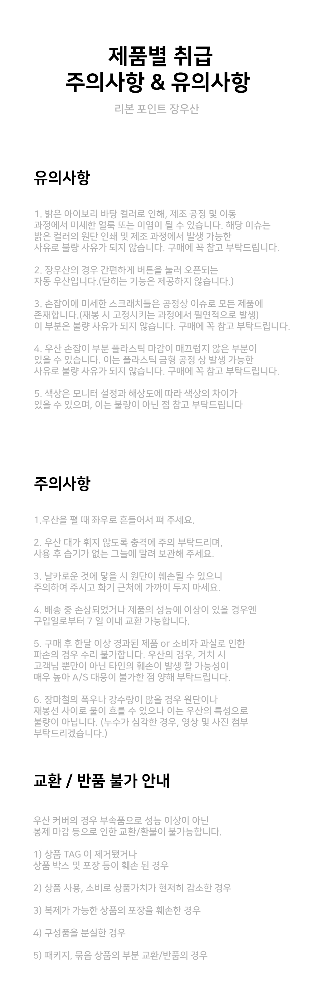 우산을 펼 때 좌우로 흔들어서 펴 주세요. / 장마철의 폭우나 강수량이 많을 경우 원단이나 재봉선 사이로 물이 흐를 수 있으나 이는 우산의 특성으로 불량이 아닙니다. (누수가 심각한 경우, 영상 및 사진 첨부 부탁드리겠습니다.)