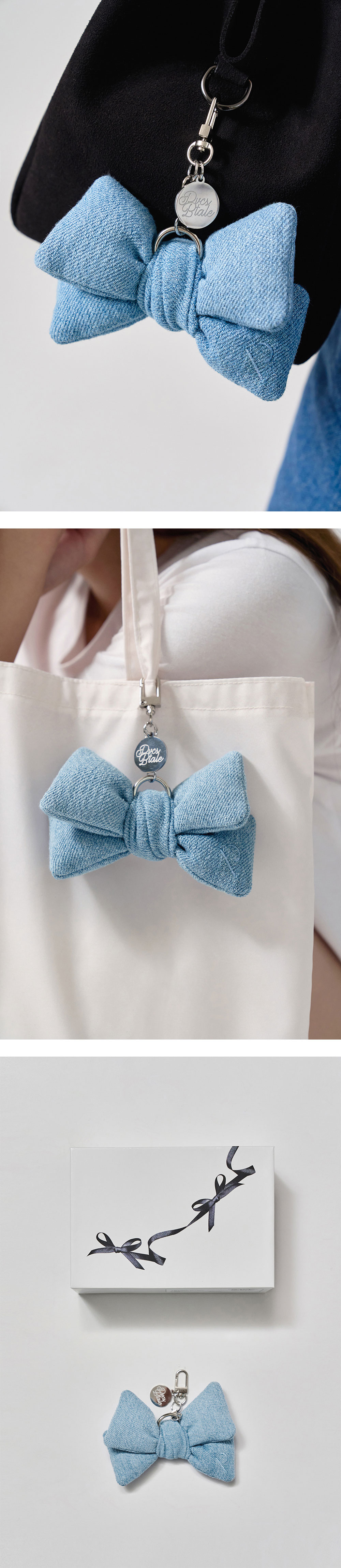 [배송 안내] * 주문(결제)일 기준 익일 출고되는 제품입니다. (공휴일/주말 제외) PVCS 데님 원단과 블루밍테일의 리본 키링의 만남, 은은한 'P' 자수 포인트, 수납상자로 활용가능한 스페셜 패키지 에디션. PVCS x 블루밍테일 콜라보레이션 한정 판매로 진행됩니다. 1. 데님 패브릭의 러블리한 리본 디자인 키링 2. 패브릭 안 쪽에 솜이 들어있어 말랑말랑한 촉감 3. 콜라보 로고 각인 코인참