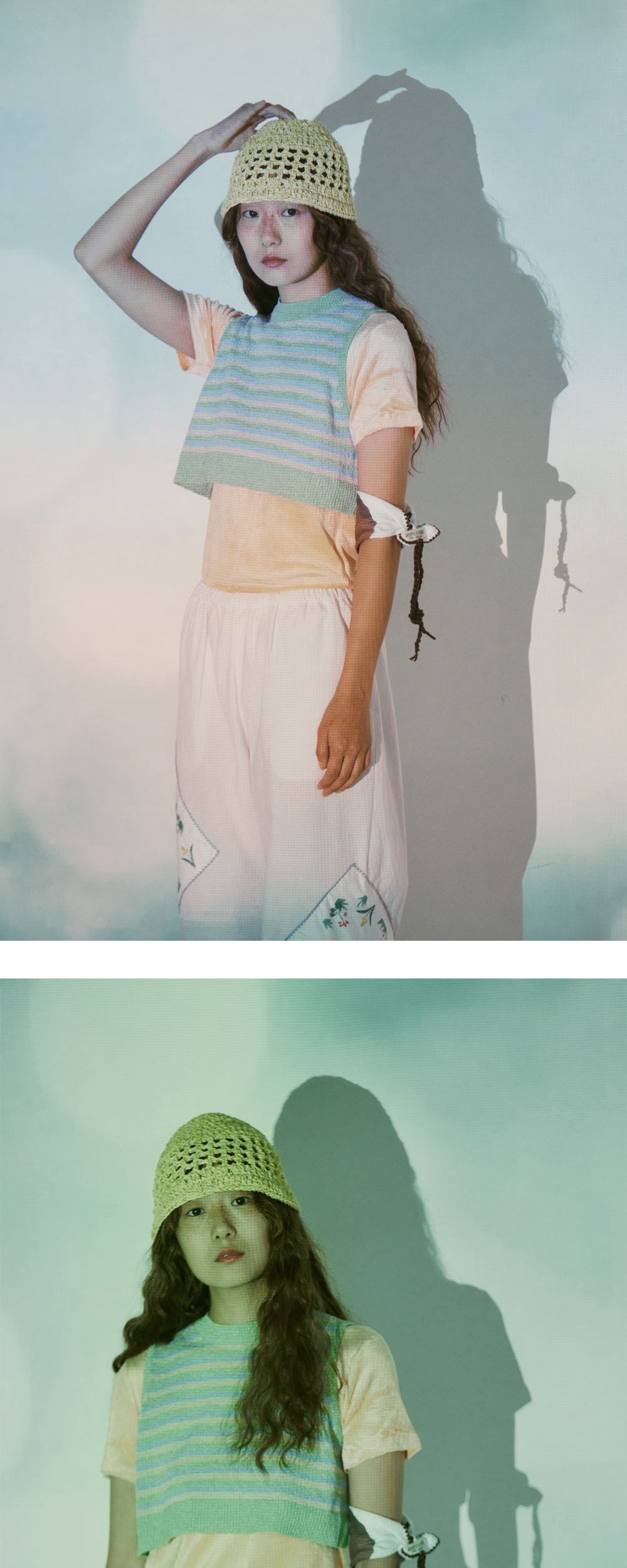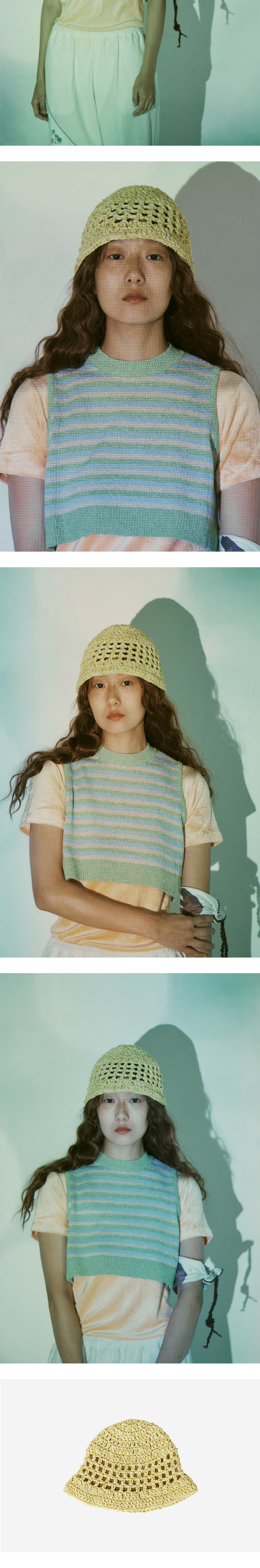 * 100% 핸드메이드 제품입니다. * 리넨과 실크 원사를 사용하여 가볍고 시원한 소재로 짜인 여름 버킷 햇입니다.