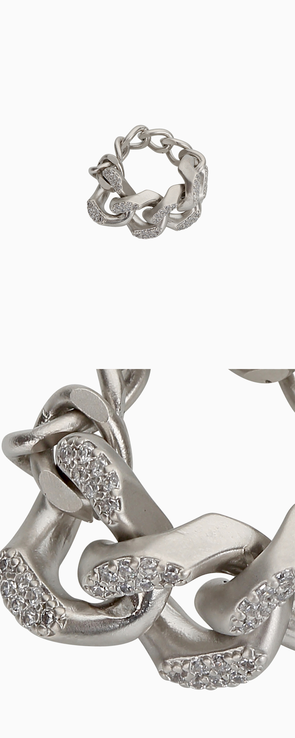 두 가지 크기의 커브체인을 믹스하여 큐빅 지르코니아 장식으로 포인트를 준 반지입니다. 과하지 않은 크기의 장식을 사용하여 전체적인 룩을 완성시키는데 유용한 제품입니다.