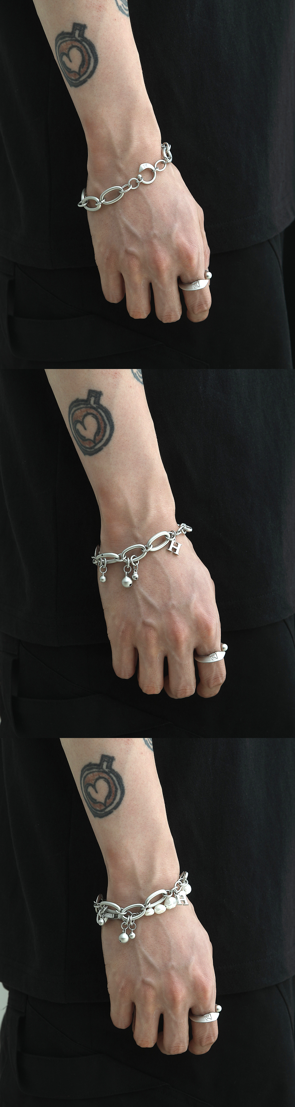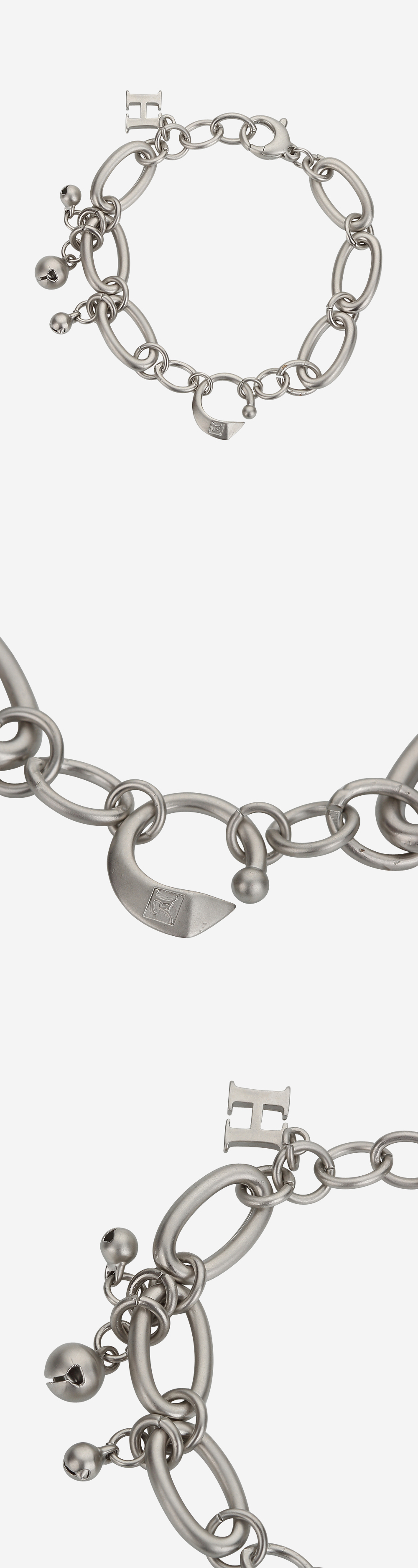 다양한 로고 메탈 참이 믹스된 팔찌입니다. 벨 형태의 메탈 참과 피어싱 형태로 이어진 메탈 체인이 특징입니다. - DETAIL - 로고 메탈 참 벨 참