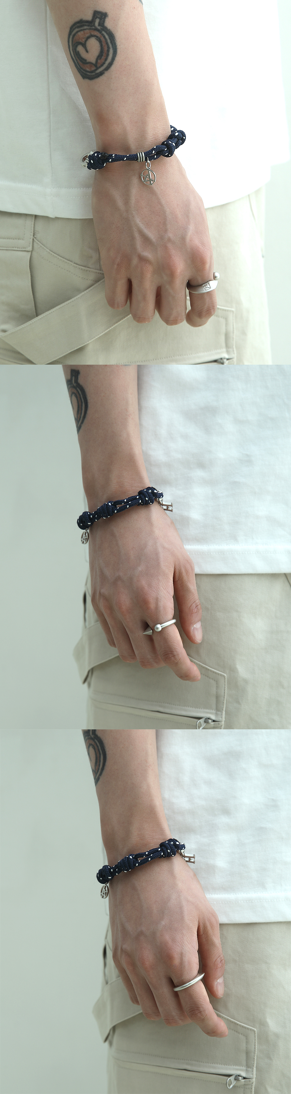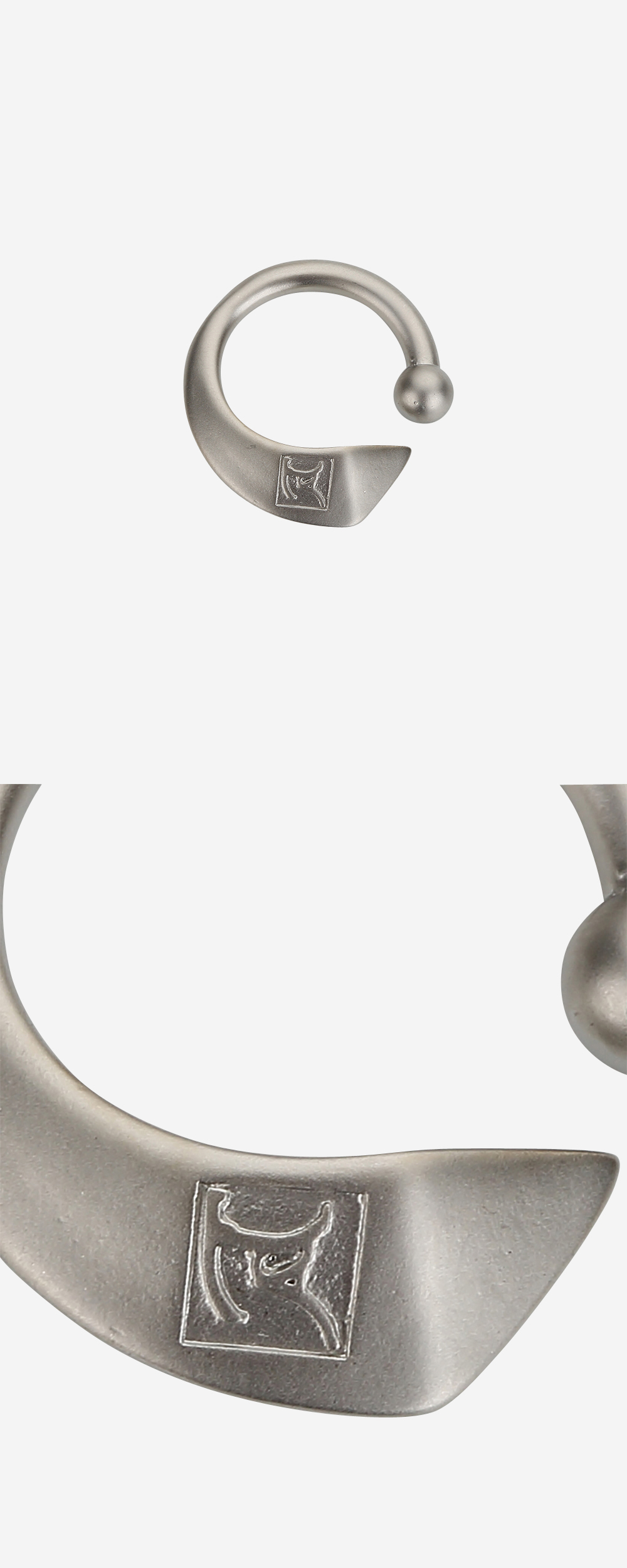 피어싱 형태의 메탈과 로고 각인이 조화로운 반지입니다 . 독특한 실루엣과 적당히 볼드한 형태로 레이어드로 연출하기 좋습니다.