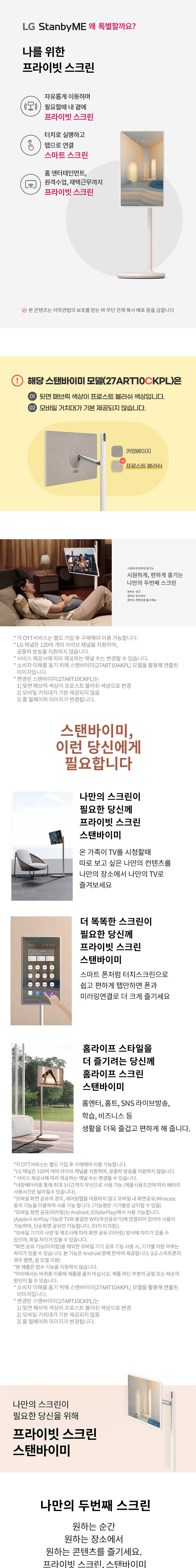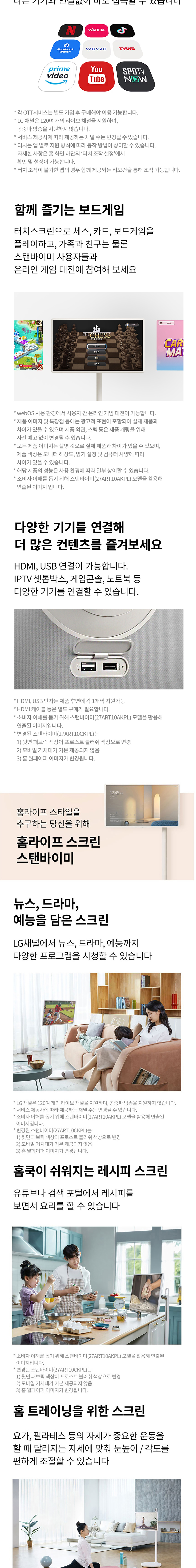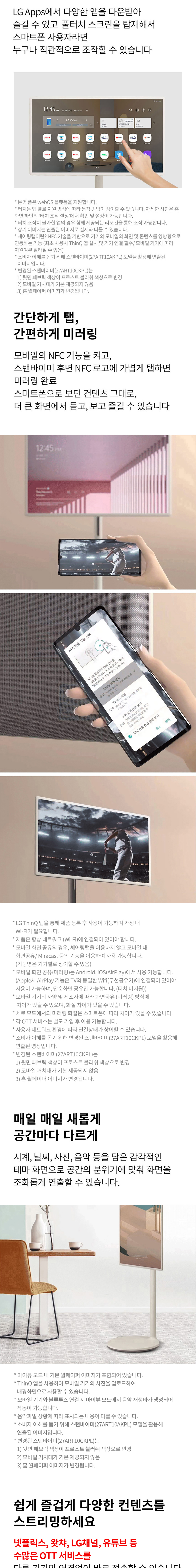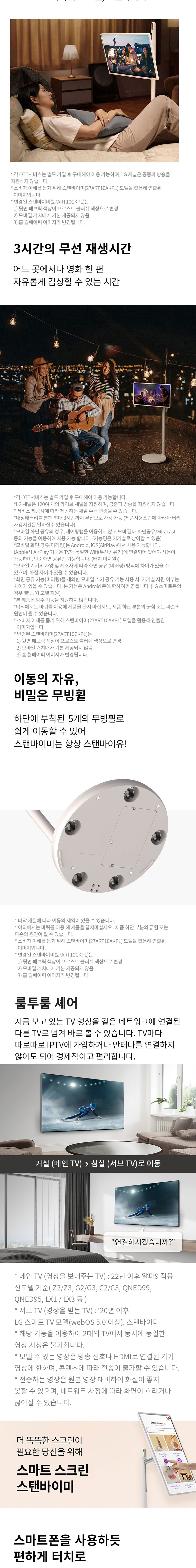 프라이빗스크린 / 스마트 스크린 / 홈라이프 스크린 원하는 곳에 스탠바이미와 함께 무선과 무빙휠을 이용해 다양한 장소로 이동할 수 있습니다. 필요한 순간 내 곁에 두고 나를 위한 화면을 감상해보세요. 스마트폰처럼 터치스크린으로 쉽고 편하게 시계, 날씨, 사진, 음악 등을 담은 감각적인 테마 화면으로 공간의 분위기에 맞춰 화면을 조화롭게 연출