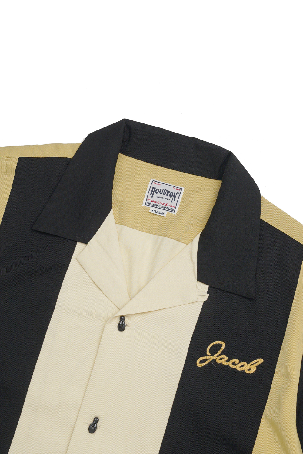 Houston Japan 41093 Bowling Shirt (Crazy) - Black 휴스턴 재팬의 썸머 스테디 셀러 아이템 '볼링 셔츠'입니다. 소재는 레이온을 사용하여, 부드러우면서도 은은한 광택이 특징입니다. 목 부분은 오픈카라 형태이며, 좌측 상단에는 네임자수가 놓여있습니다. 프론트에는 볼링핀 디자인의 유니크한 버튼을 채택하였습니다.