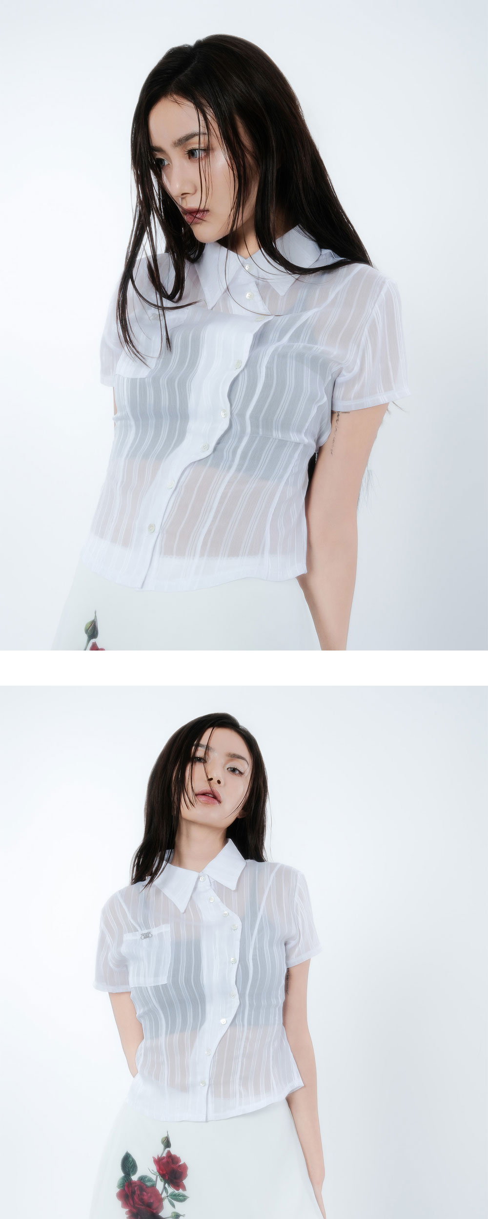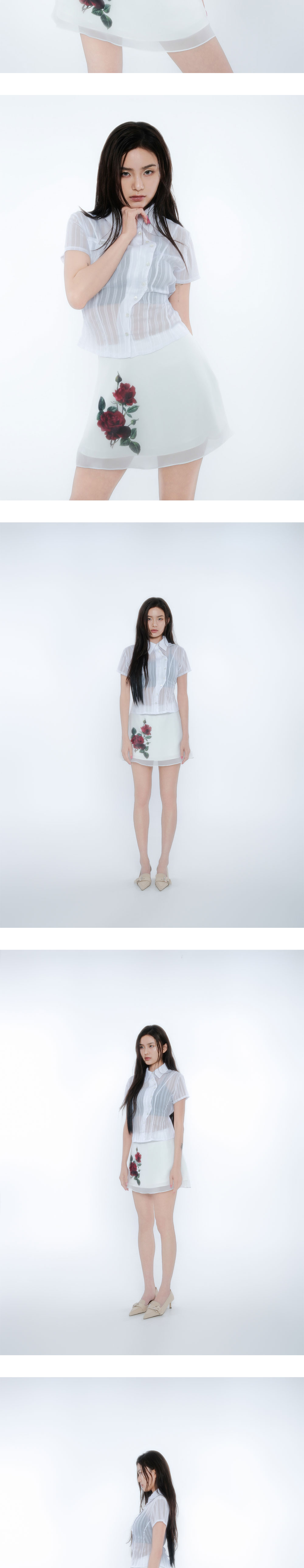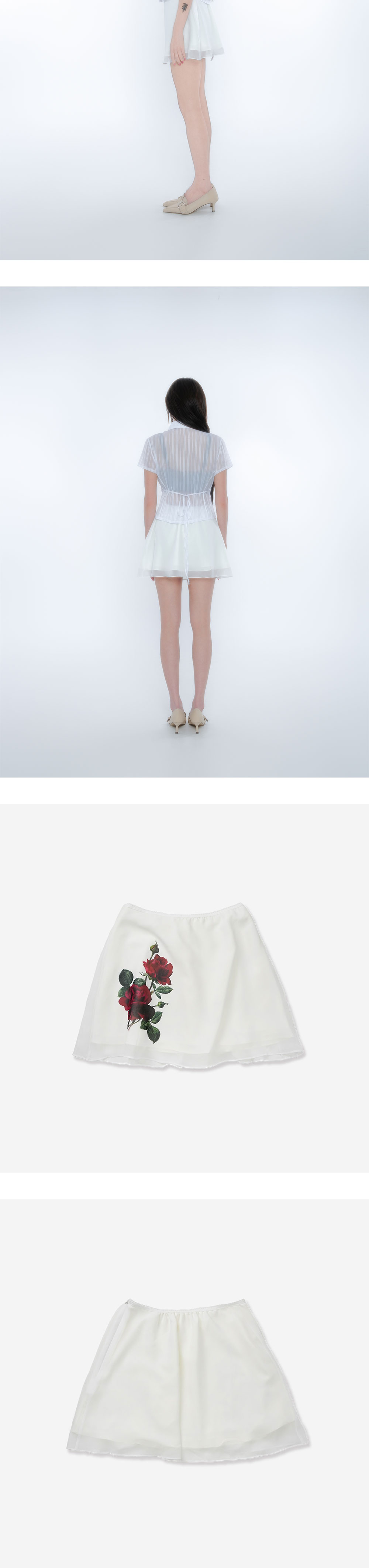 광택감 있는 얇은 공단과 쉬폰 원단 두겹의 레이어 외에 안감있음 / 앞판 장미 디지털 프린팅 / 허리라인 레이스 마감