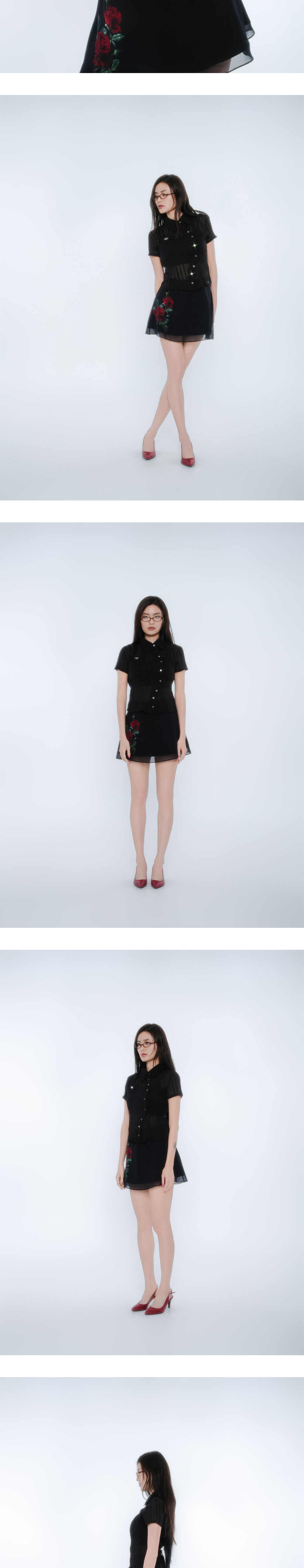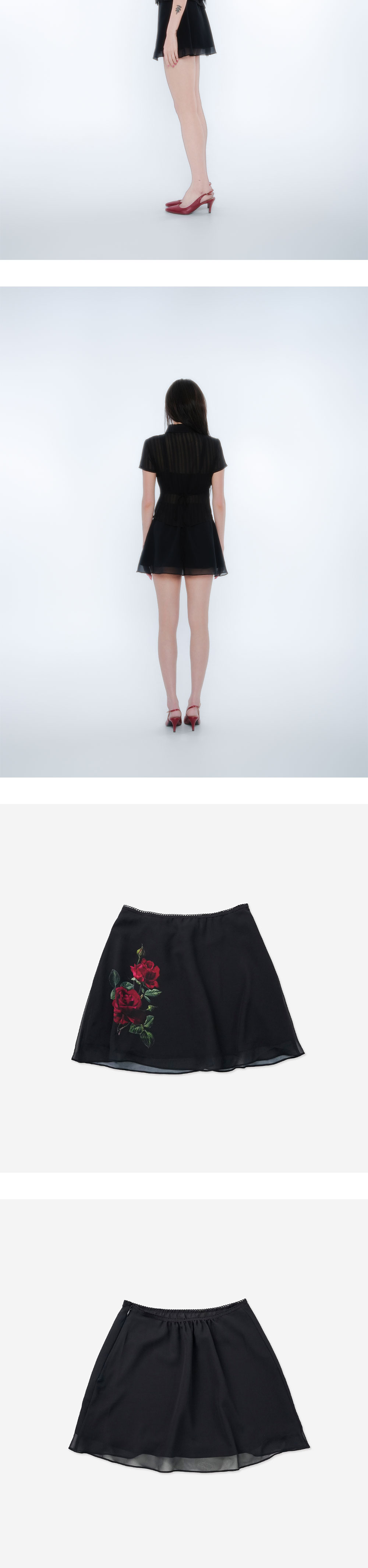 광택감 있는 얇은 공단과 쉬폰 원단 두겹의 레이어 외에 안감있음 / 앞판 장미 디지털 프린팅 / 허리라인 레이스 마감