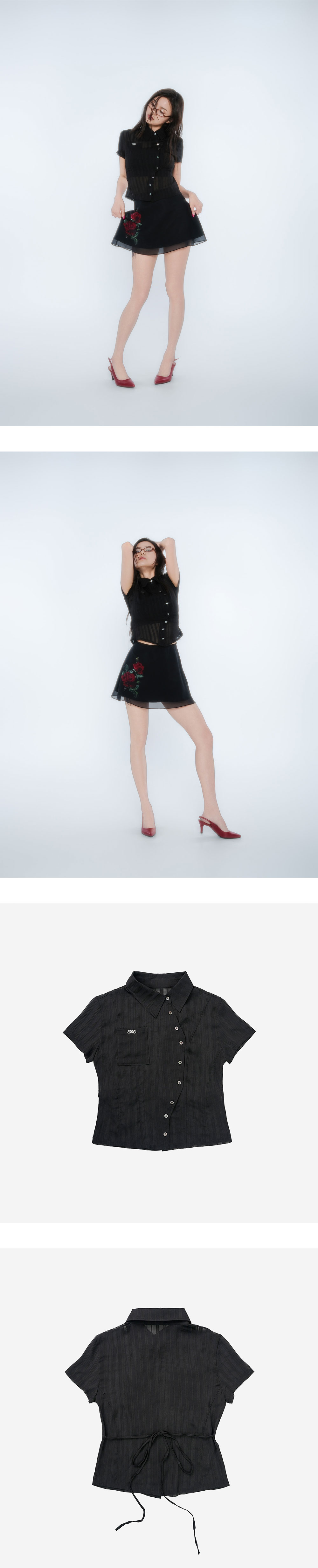 비대칭 카라와 앞중심 여밈/ 시스루 스트라이프 원단 / 자개 단추 / 허리 스트링