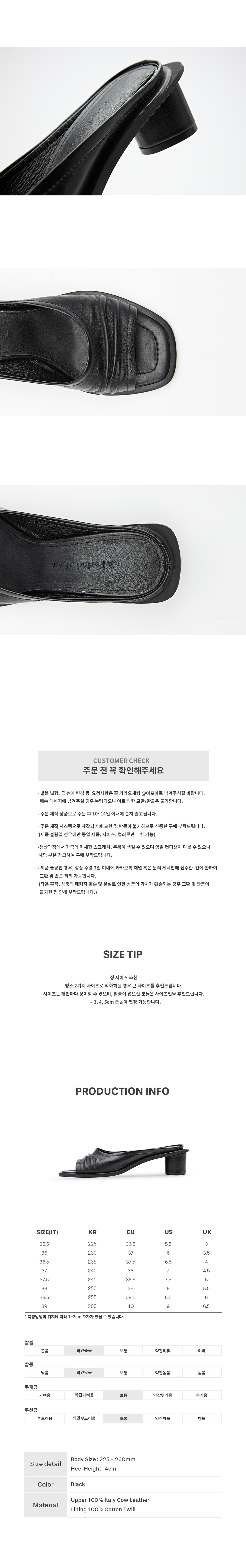 Pli Square Mule은 자연스러운 셔링 디테일을 활용하여 클래식하면서 빈티지한 무드가 돋보이는 디자인의 슈즈입니다. 이태리 카우 레더를 사용하여 은은한 광택이 매력적이며, 유려한 곡선의 스퀘어 라인이 클래식한 무드를 연출할 수 있습니다. 밑창은 미끄럼 방지 처리를 하여 관리가 용이하고, 실용적인 고무 소재의 창을 활용하였습니다.